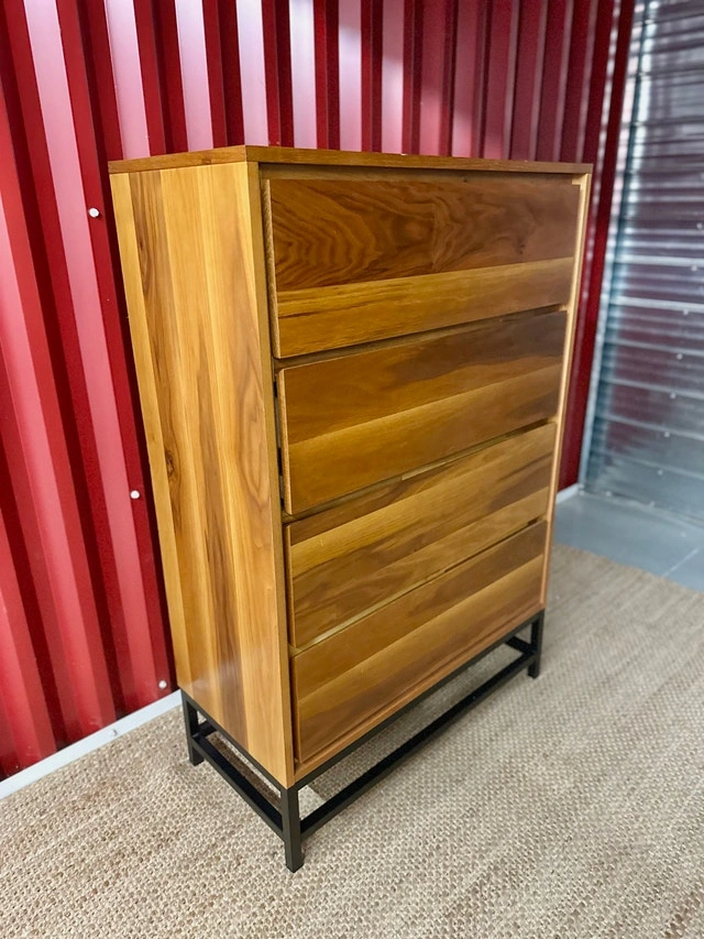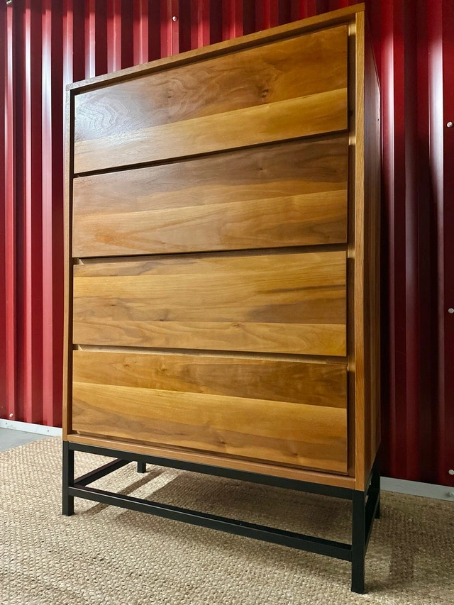 Excellent used condition walnut dresser with a black metal base and 4 pull-out drawers. This modern piece has an MCM style. The wood is in overall great shape with minimal wear.