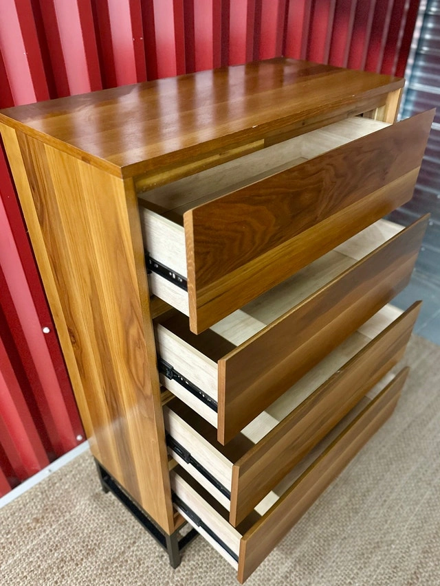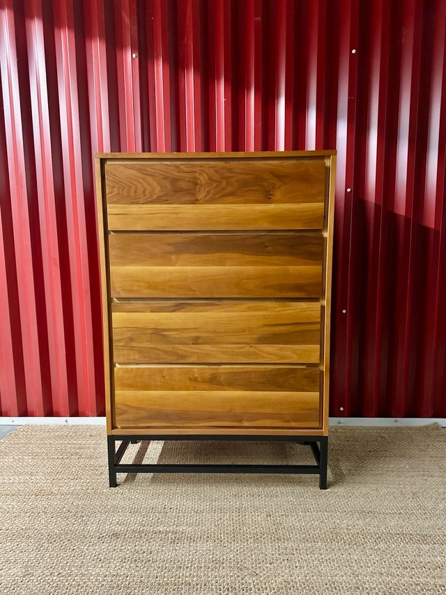 Excellent used condition walnut dresser with a black metal base and 4 pull-out drawers. This modern piece has an MCM style. The wood is in overall great shape with minimal wear.