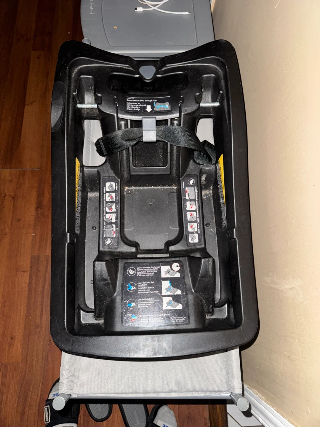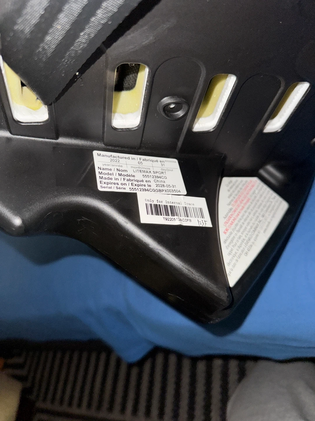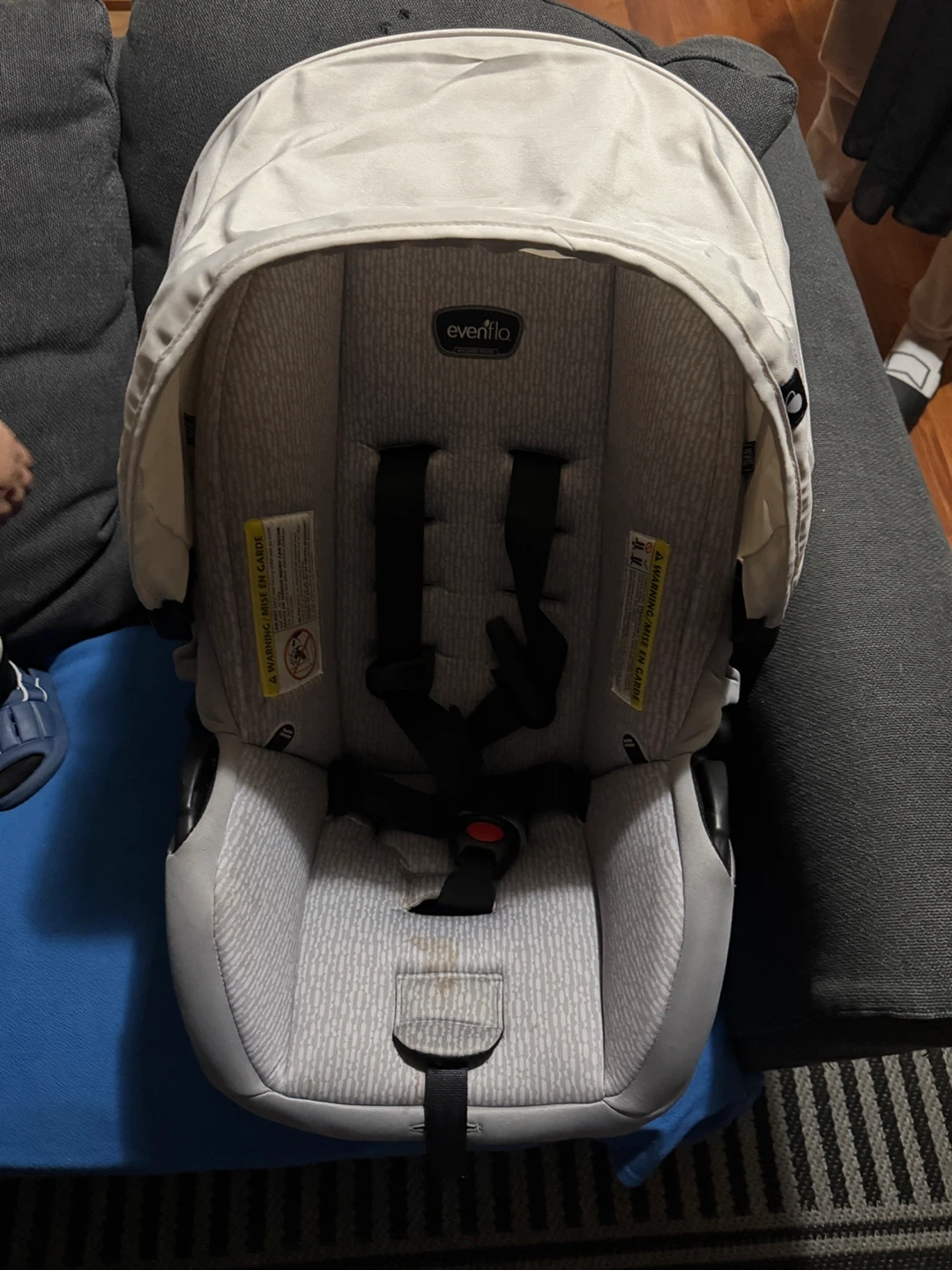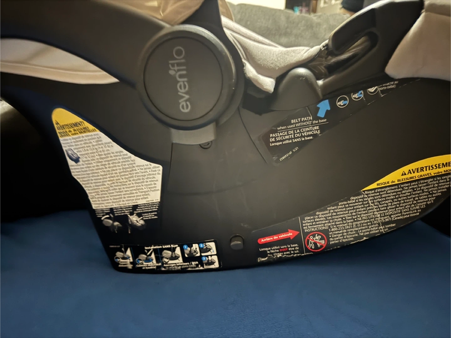 This Evenflo Litemax Sport infant car seat is grey and comes with a base. It was manufactured in 2022. This car seat is designed for infants and offers a secure way to transport them.