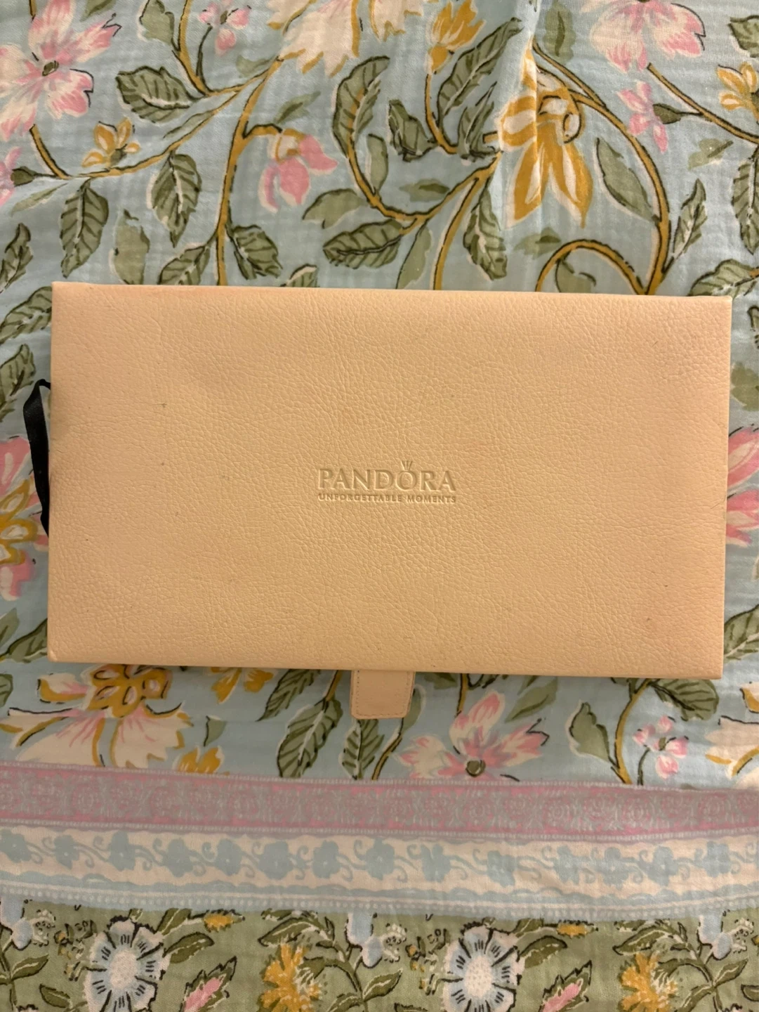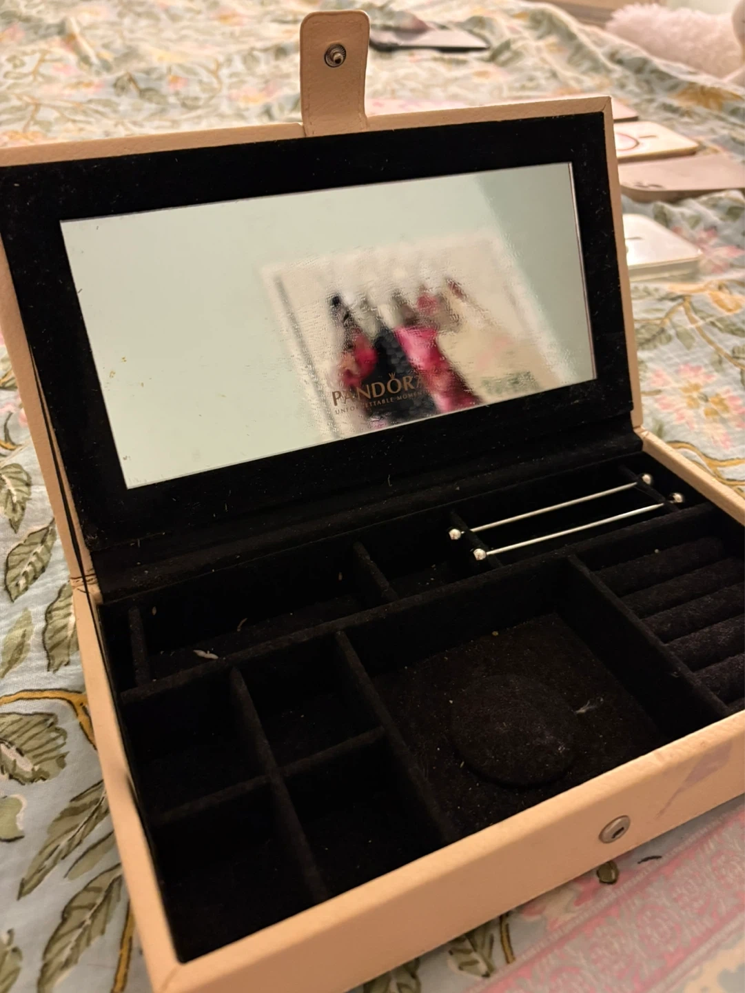 Beige faux leather Pandora jewellery box with a mirror inside. Features multiple compartments for rings, earrings, and other accessories. Great for keeping your jewellery organized!