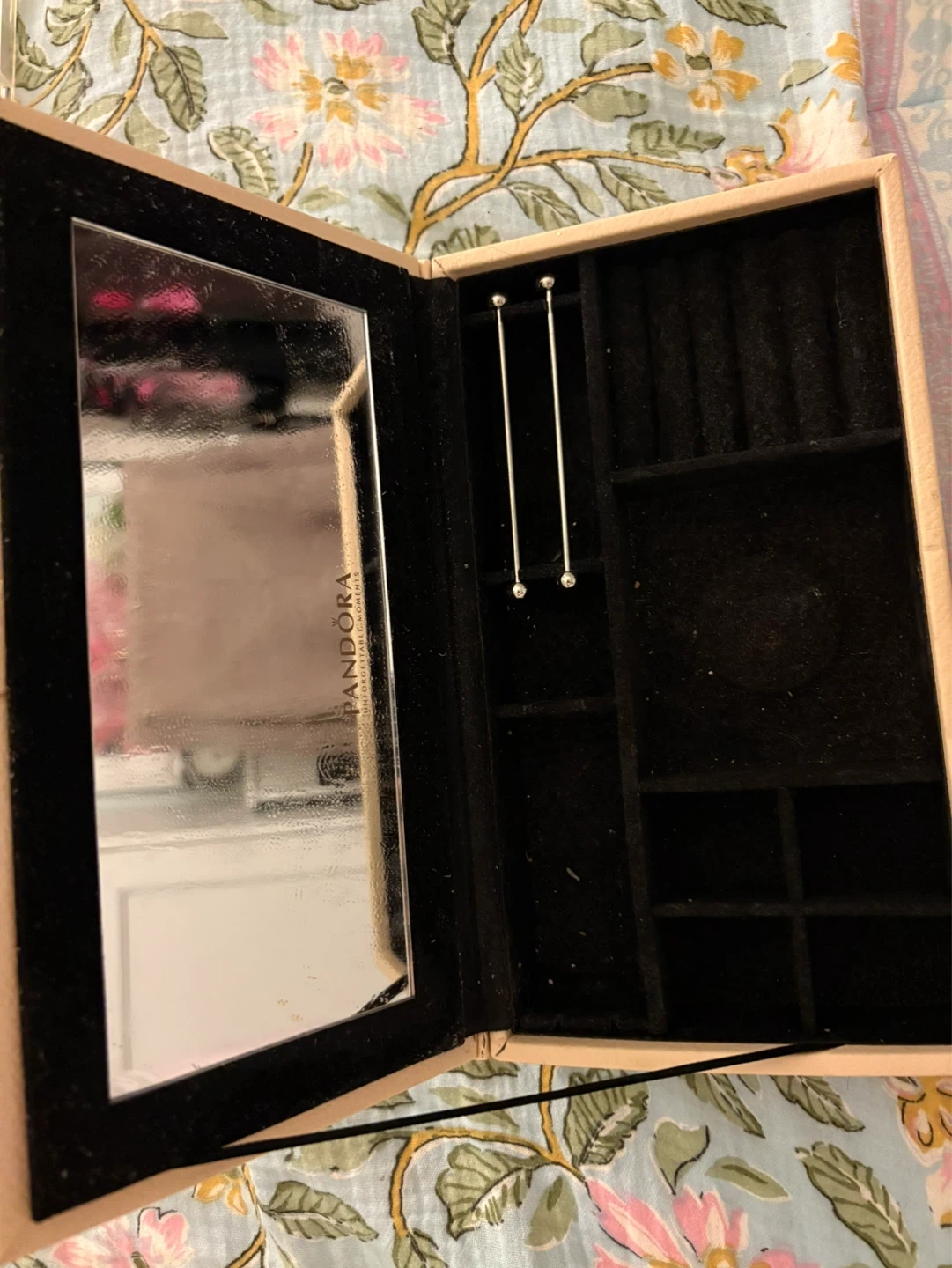 Beige faux leather Pandora jewellery box with a mirror inside. Features multiple compartments for rings, earrings, and other accessories. Great for keeping your jewellery organized!