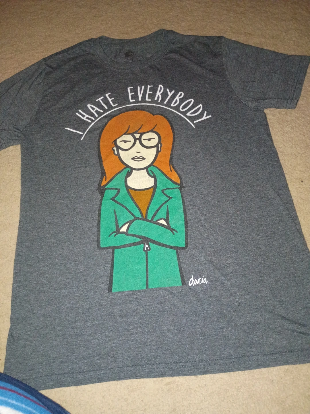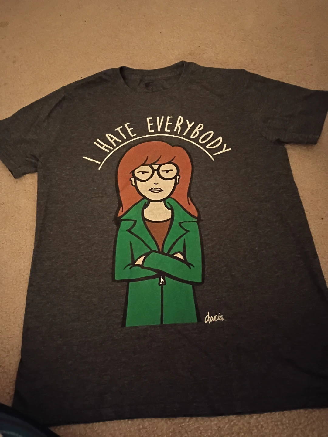 Grey t-shirt featuring Daria with the text "I Hate Everybody". Made from a soft cotton blend. This shirt's for fans of the iconic 90s cartoon! Got this shirt in early 2017 used it a lot and still in really good condition! From Spencer's and MTV original show. Super comfortable and not a tight shirt