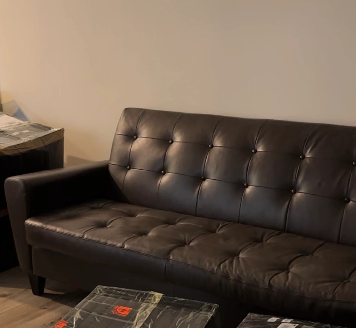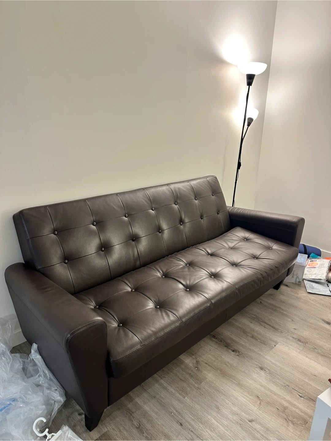 This is a dark brown sofa with a faux leather finish. It features button tufting on the back and seat cushions for a classic look. This sofa would be great for a living room or den!