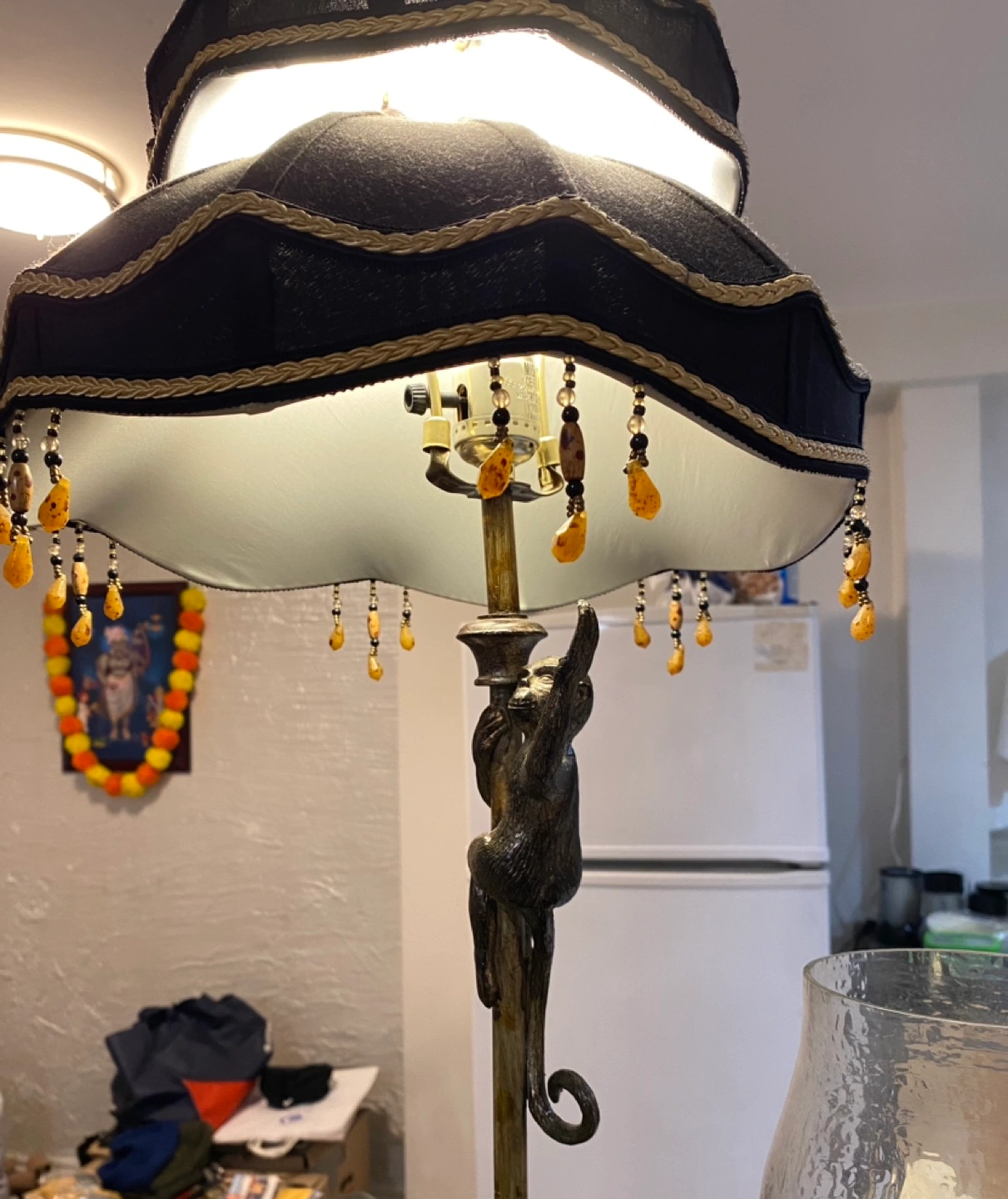 Beautiful table lamp features a monkey design. Double-layered lampshade, black and off-white. Amber coloured beads adorn the shade. Great statement piece.