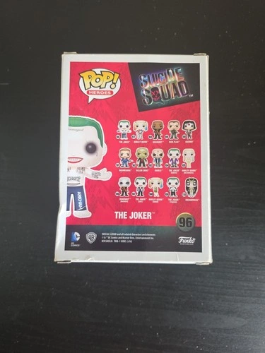 Funko Pop! Heroes #96 – The Joker from Suicide Squad (2016). Vinyl figure. Figure is complete and in good condition. Original box included. Box shows visible shelf wear (corner wear, light creasing, scuffs on window). Plastic window intact. Please review photos carefully — you will receive the exact item shown.