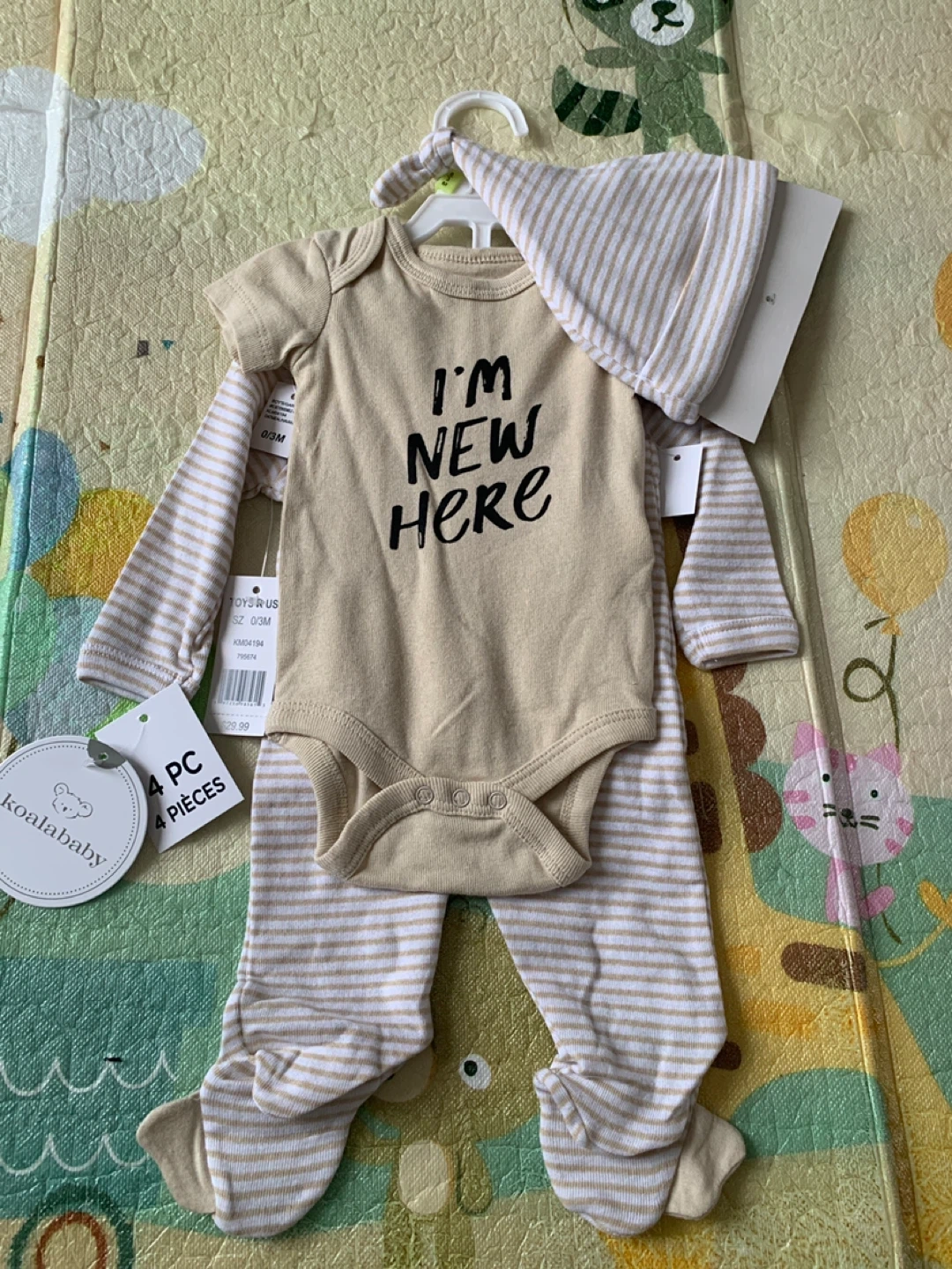 This 4-piece Koala Baby set includes a onesie, pants, a kimono top, and a hat. It's sized for 0-3 months. The outfit features a tan and white stripe pattern with cute elephant details and a "I'm New Here" graphic.