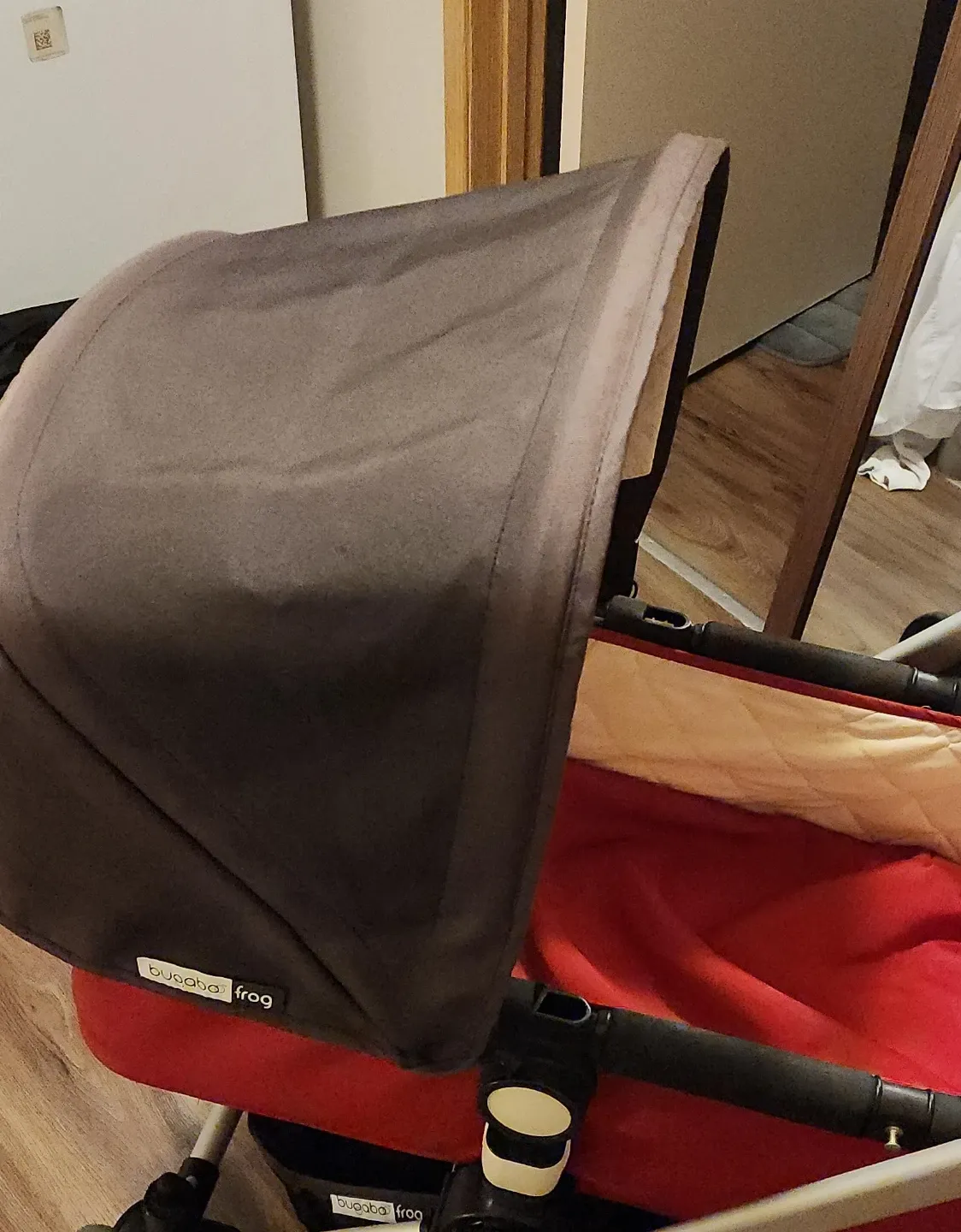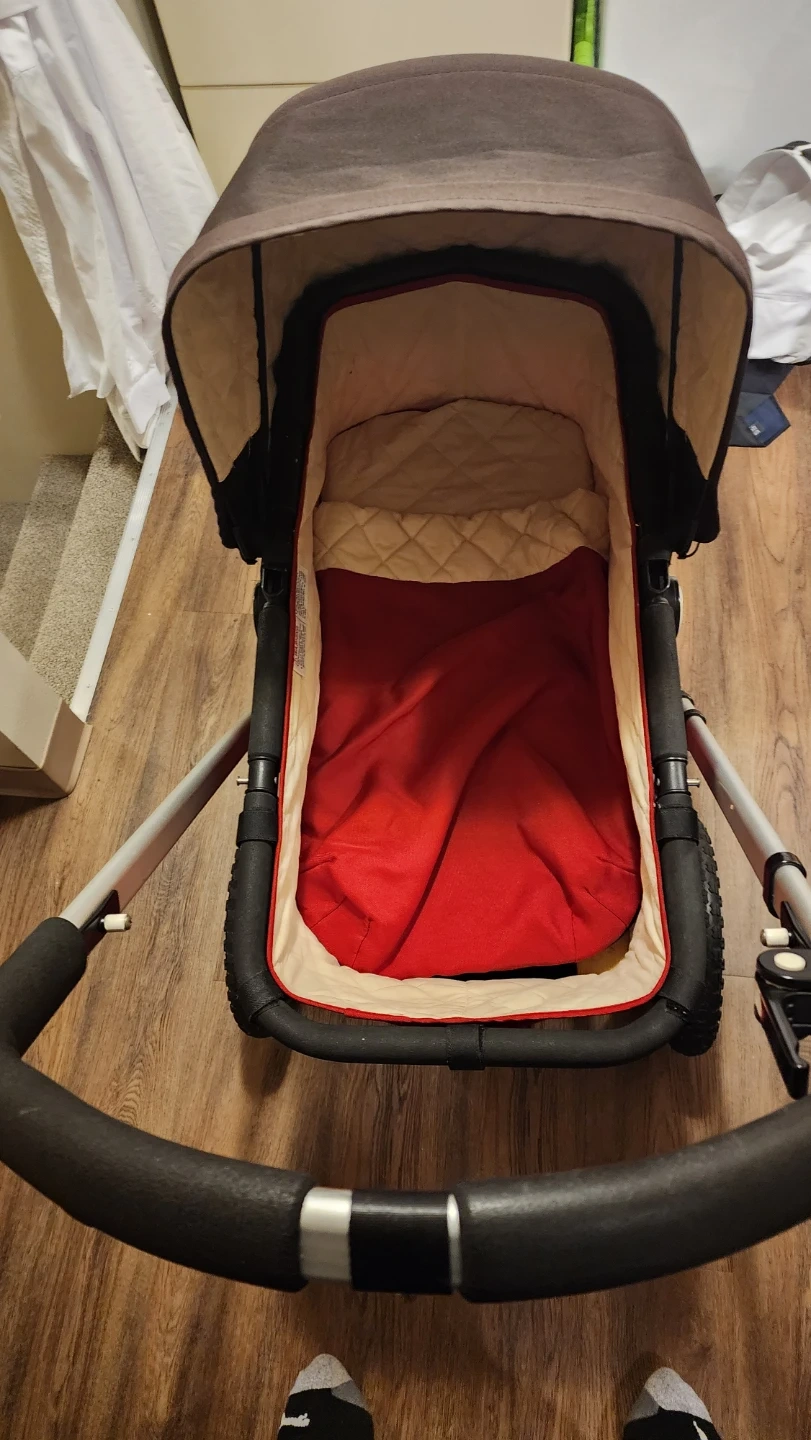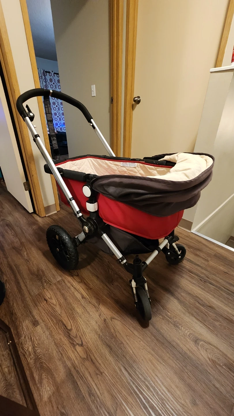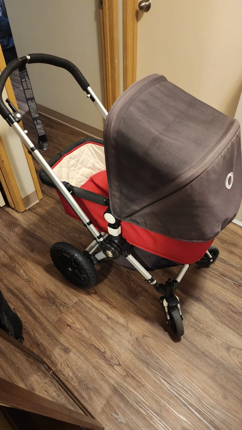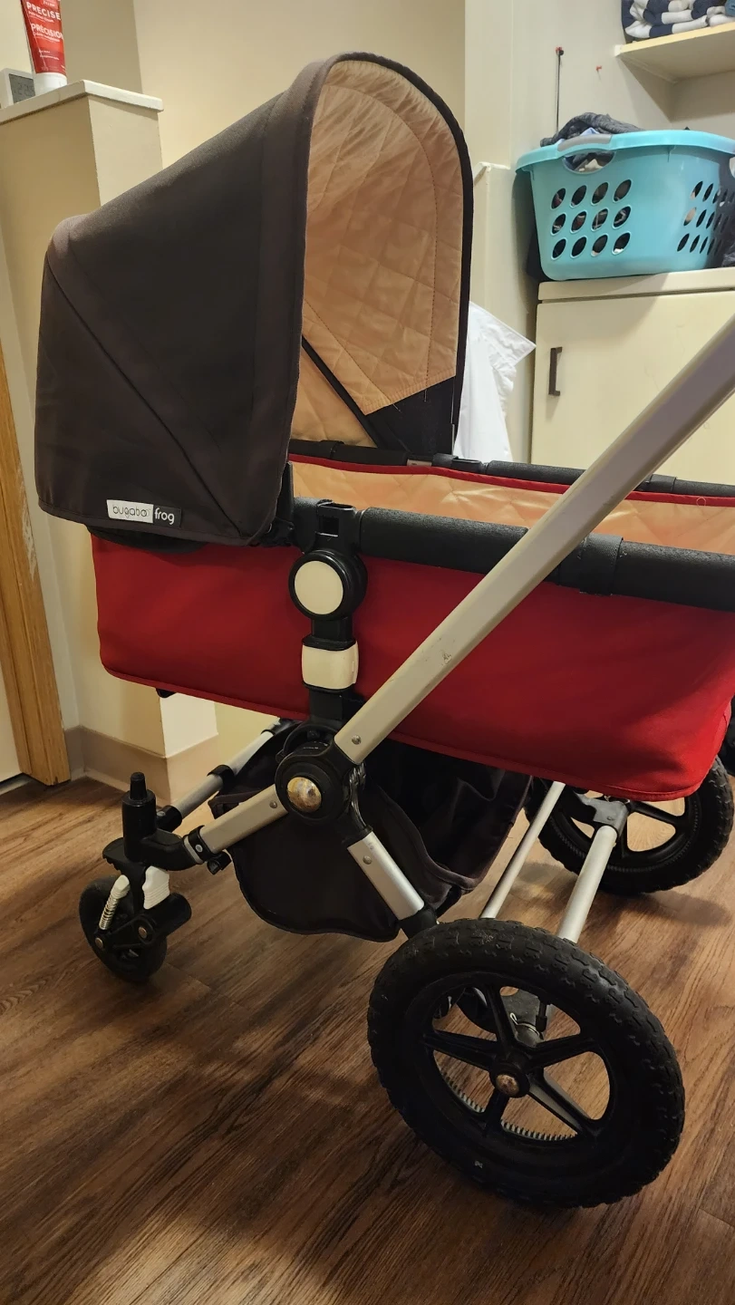 Bugaboo Frog stroller in red and brown. It's a versatile stroller for navigating different terrains. This stroller is suitable for newborns and toddlers.