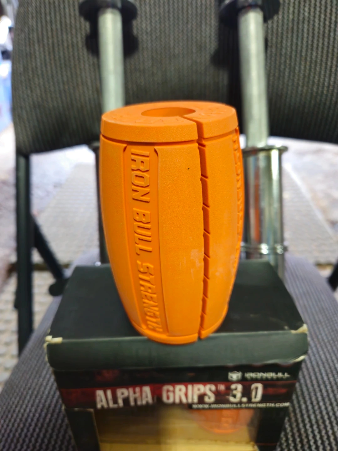 Orange Alpha Grips 3.0 by Iron Bull Strength. These are designed to enhance your grip during weightlifting. They're made from durable rubber for a secure hold.