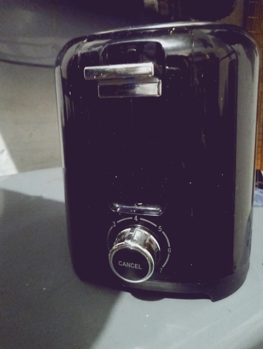 Compact black toaster. Two slices. Adjustable browning control. Cancel button. Good condition.