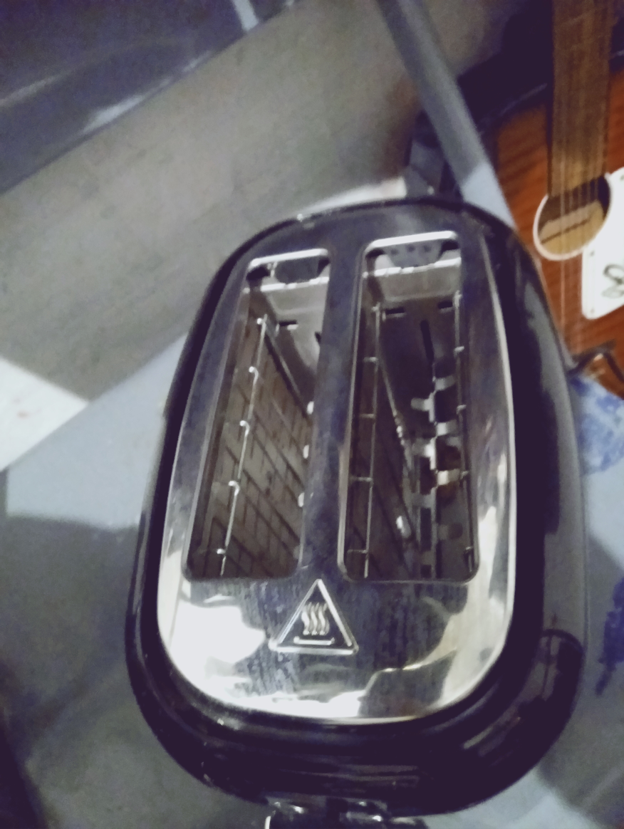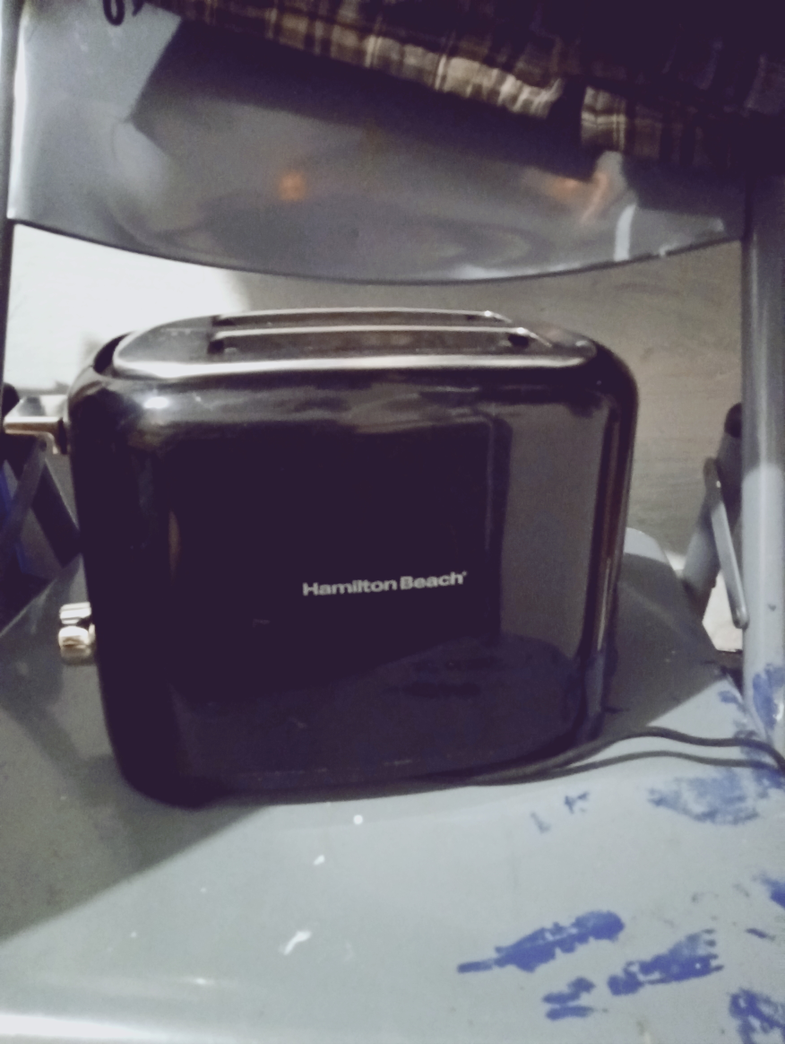 Compact black toaster. Two slices. Adjustable browning control. Cancel button. Good condition.
