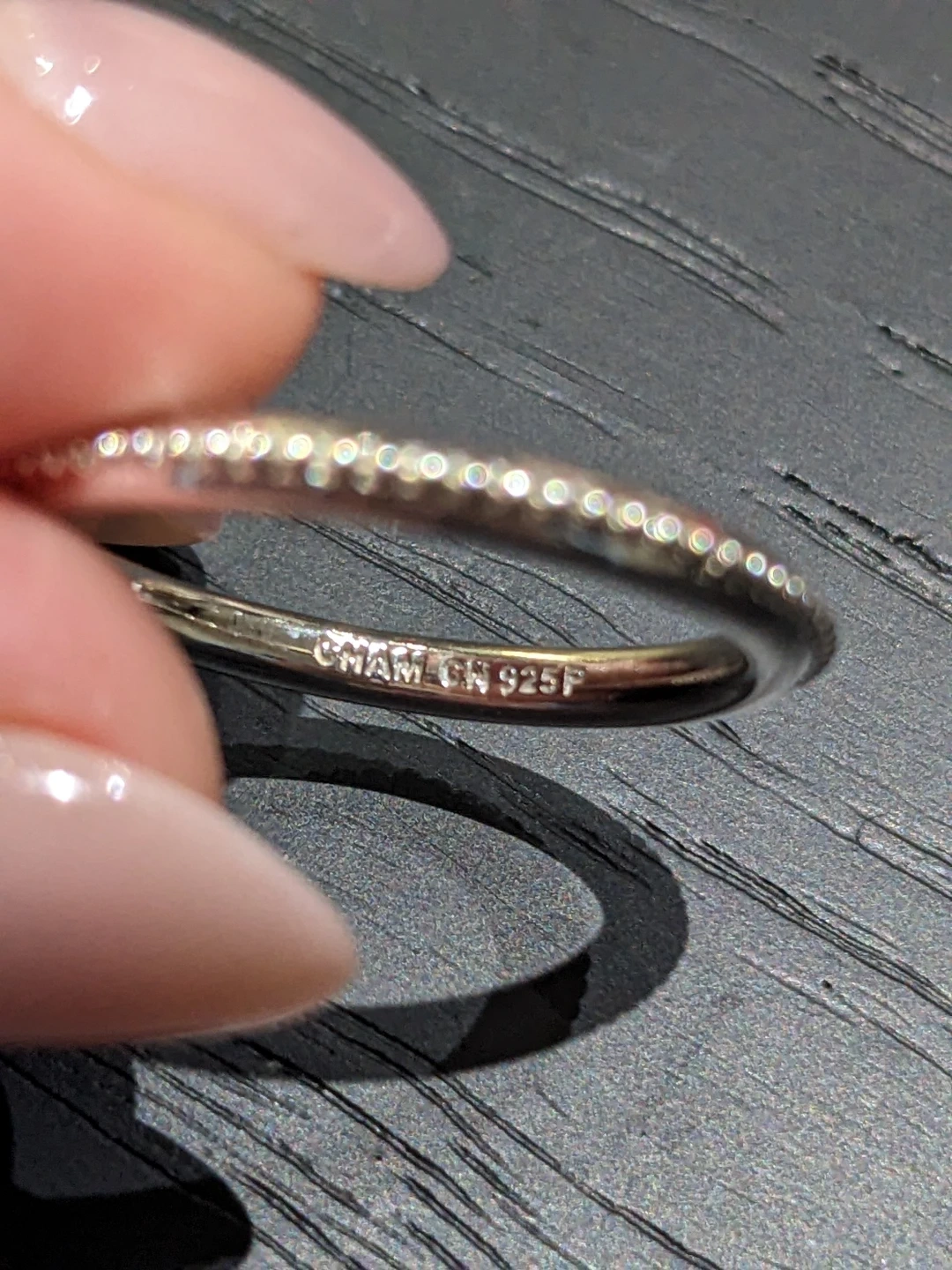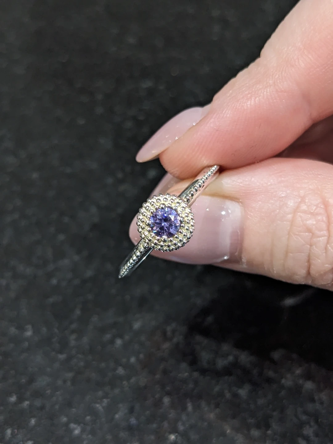 This is a never worn size 7.75 - 8 sterling silver Chamilia birthstone ring (amethyst/February). The brand Chamilia was a Swarovski brand before it was discontinued in 2019. Stamped 925 and with the CHAM brand stamp.