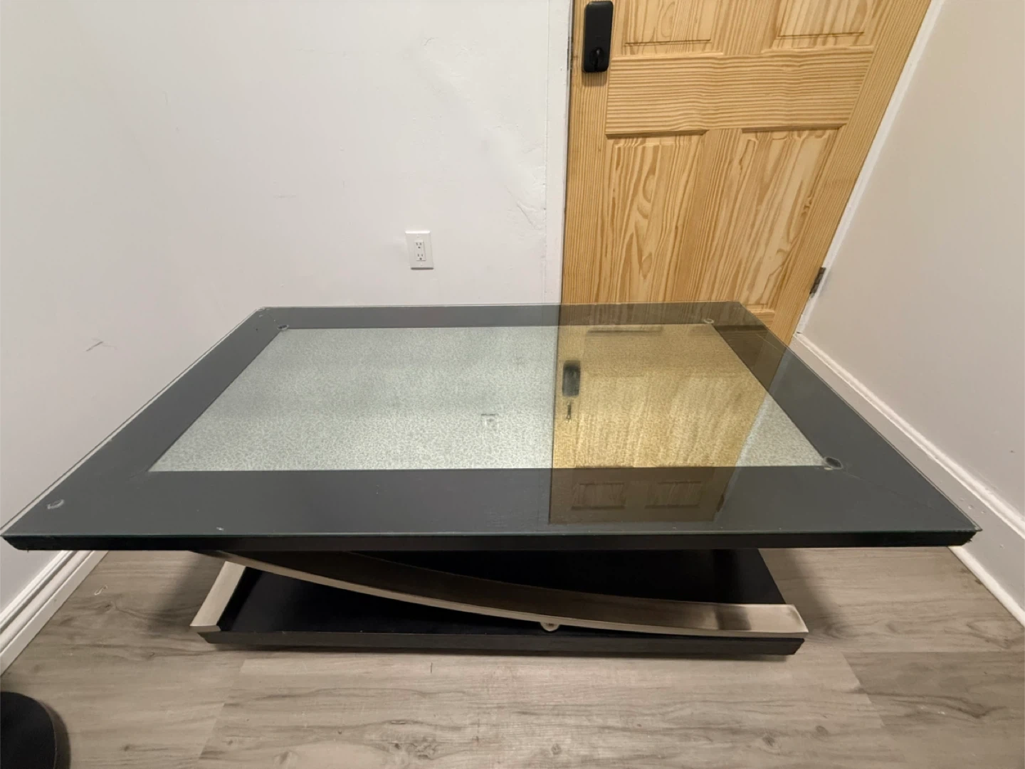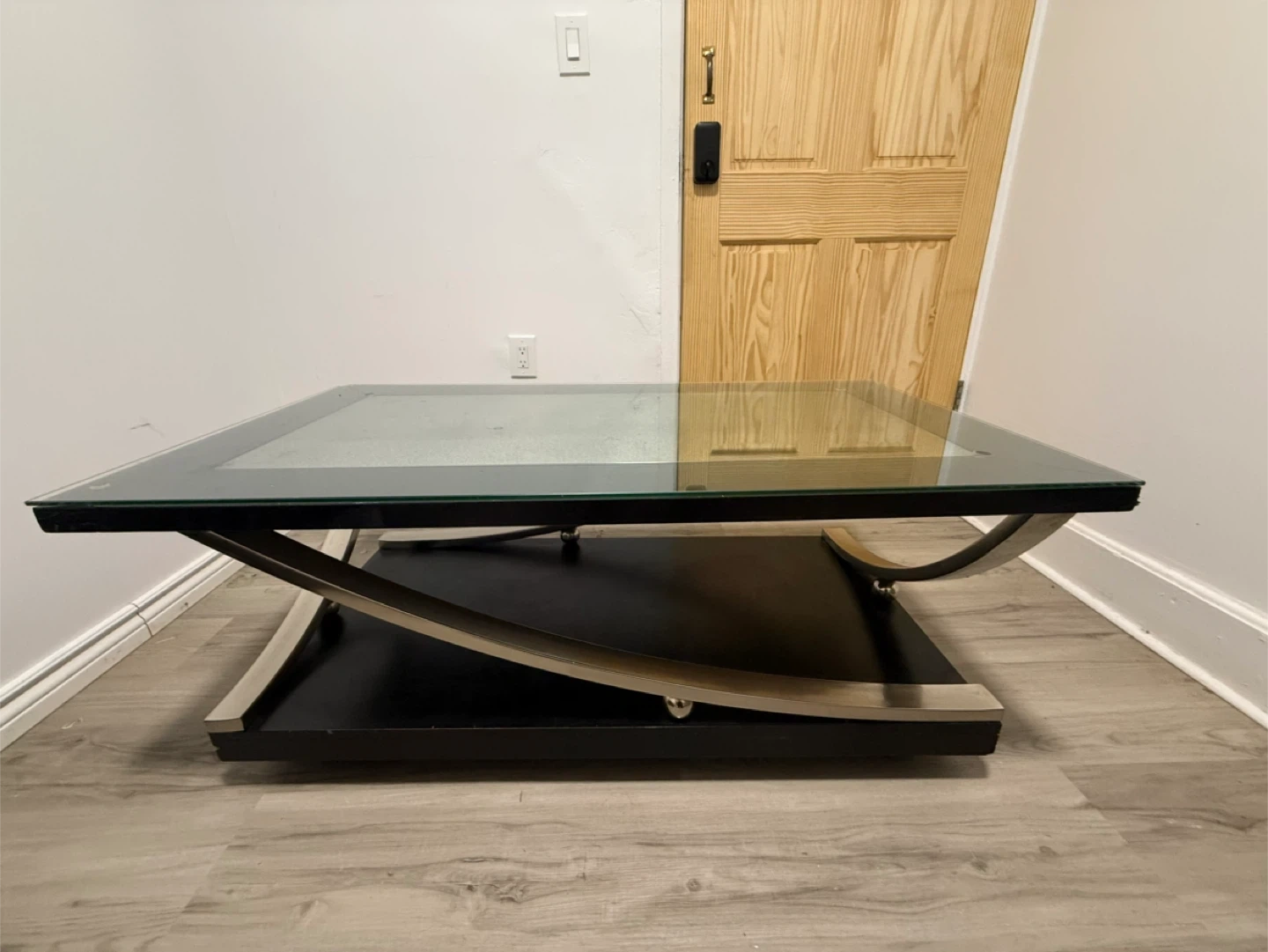 This stylish coffee table features a glass top and a sleek metal frame. Its modern design complements various decor styles. The lower shelf provides extra storage space for books or decorative items.
