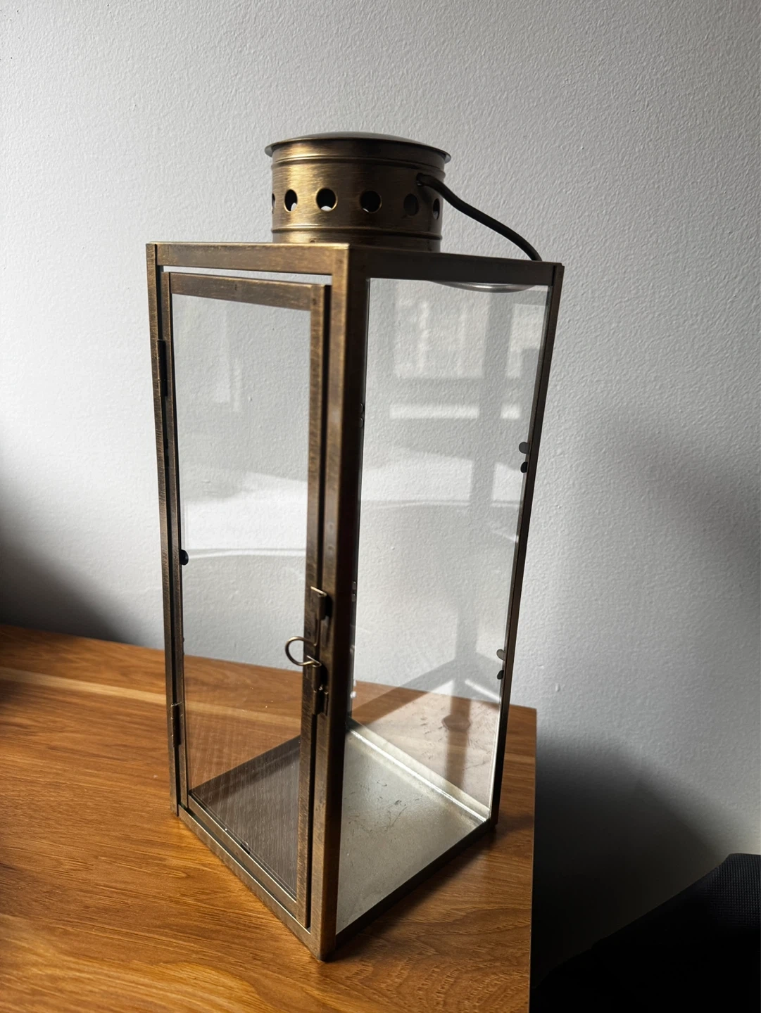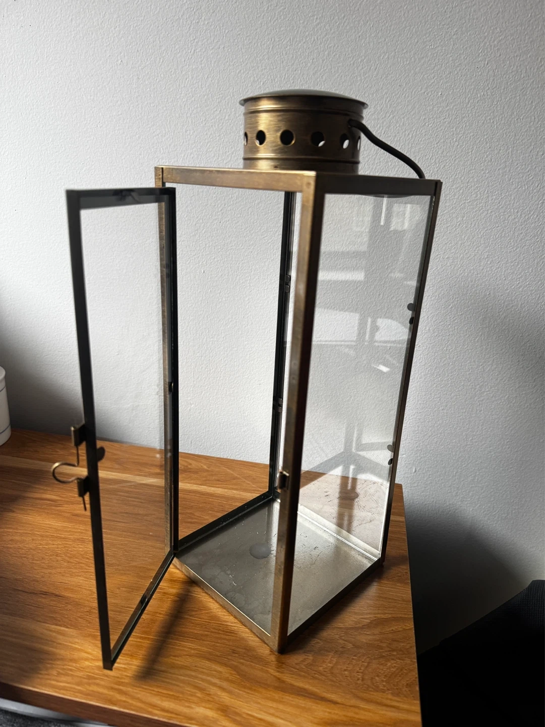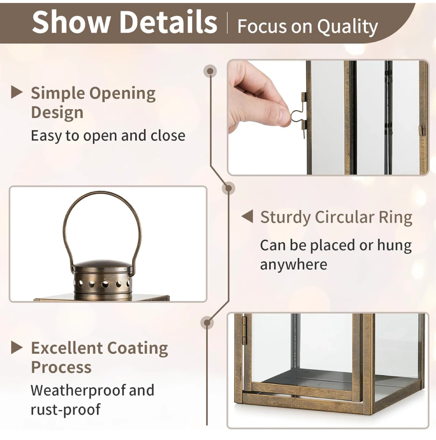 This lantern features a sturdy metal frame with a weatherproof, rust-proof coating. It has a simple opening design for easy access and a circular ring for placement or hanging. The glass panels allow for a clear view inside. A lovely addition to patios or indoor spaces!