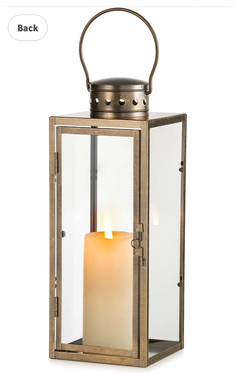 This lantern features a sturdy metal frame with a weatherproof, rust-proof coating. It has a simple opening design for easy access and a circular ring for placement or hanging. The glass panels allow for a clear view inside. A lovely addition to patios or indoor spaces!