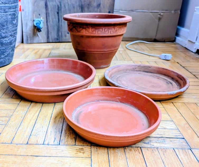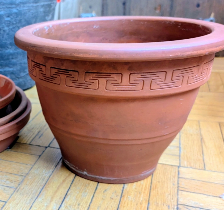 A classic terracotta plant pot (12" 9" tall) diameter with a decorative Greek key pattern. Three saucers for drainage. (10,12,12" diameter) Perfect for indoor or outdoor plants!