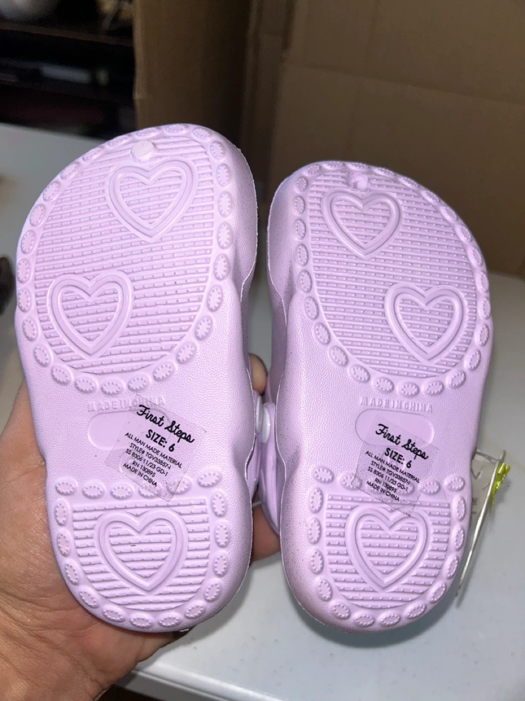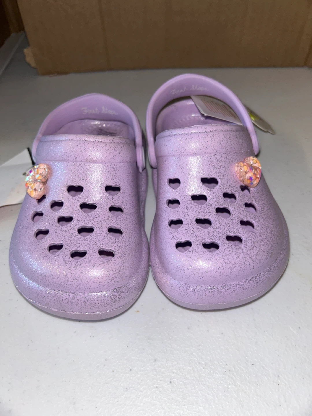 These adorable lavender glitter clogs are from First Steps! They are a size 6 and feature a cute heart detail. Perfect for your little one! “ there a slight part on one of the crocs that can be glued together look at photo “ they are brand New!