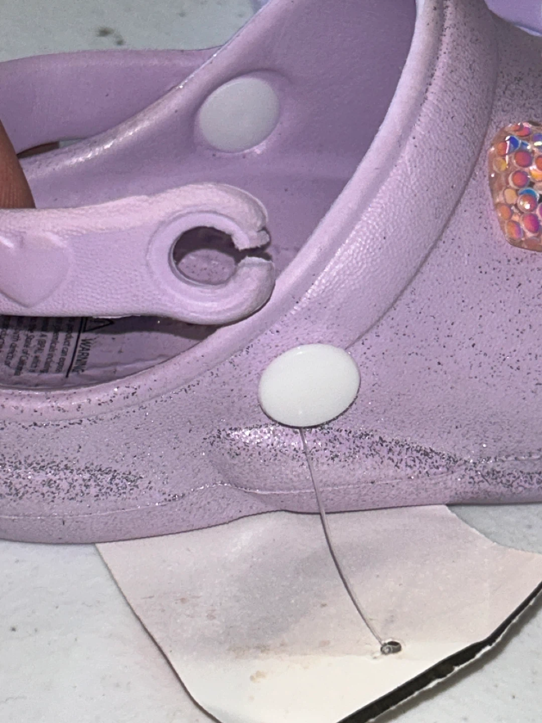 These adorable lavender glitter clogs are from First Steps! They are a size 6 and feature a cute heart detail. Perfect for your little one! “ there a slight part on one of the crocs that can be glued together look at photo “ they are brand New!