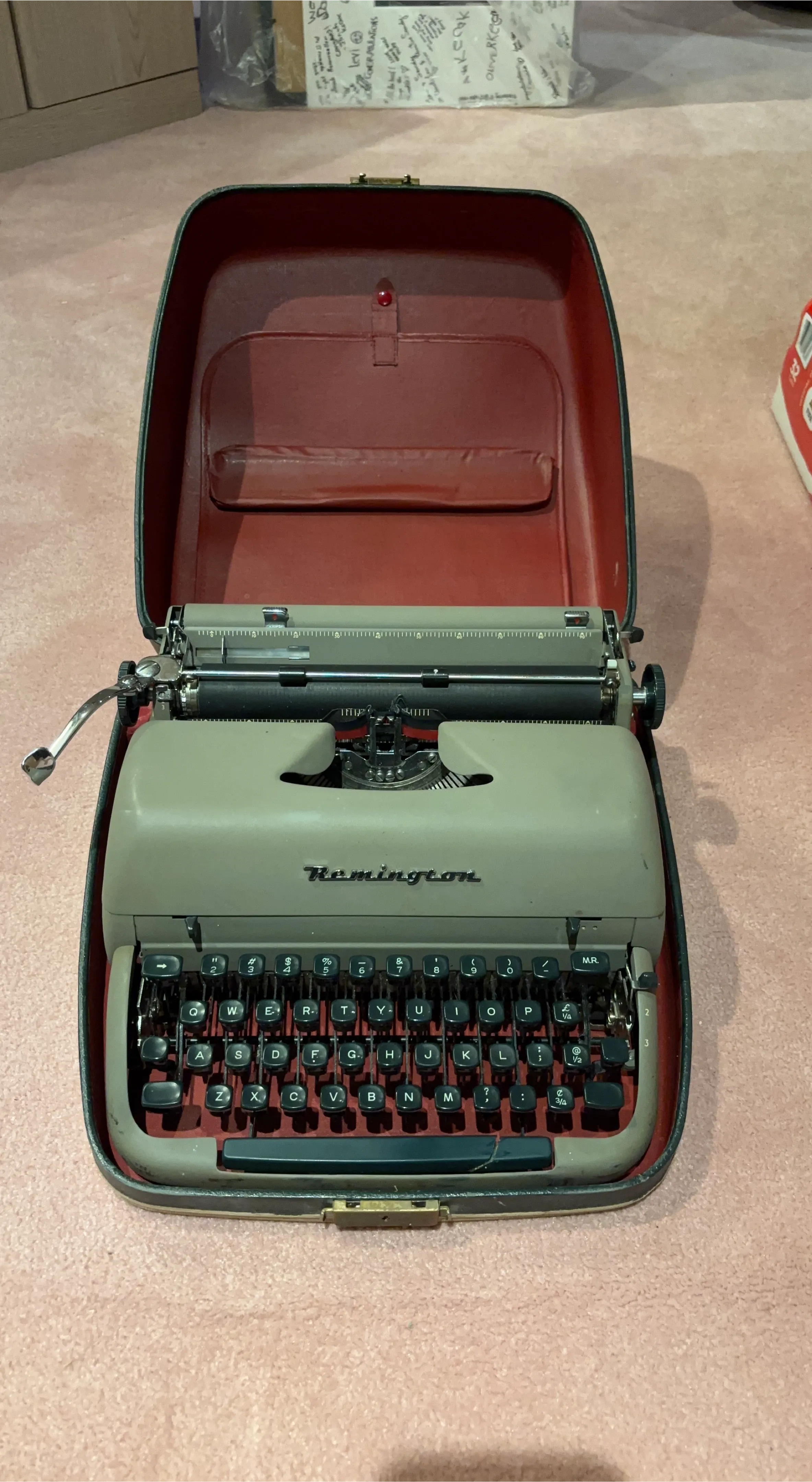 Classic Remington portable typewriter, complete with its original red interior case. It's a lovely piece of vintage technology. This typewriter would be fantastic for anyone looking to experience writing the old-fashioned way!