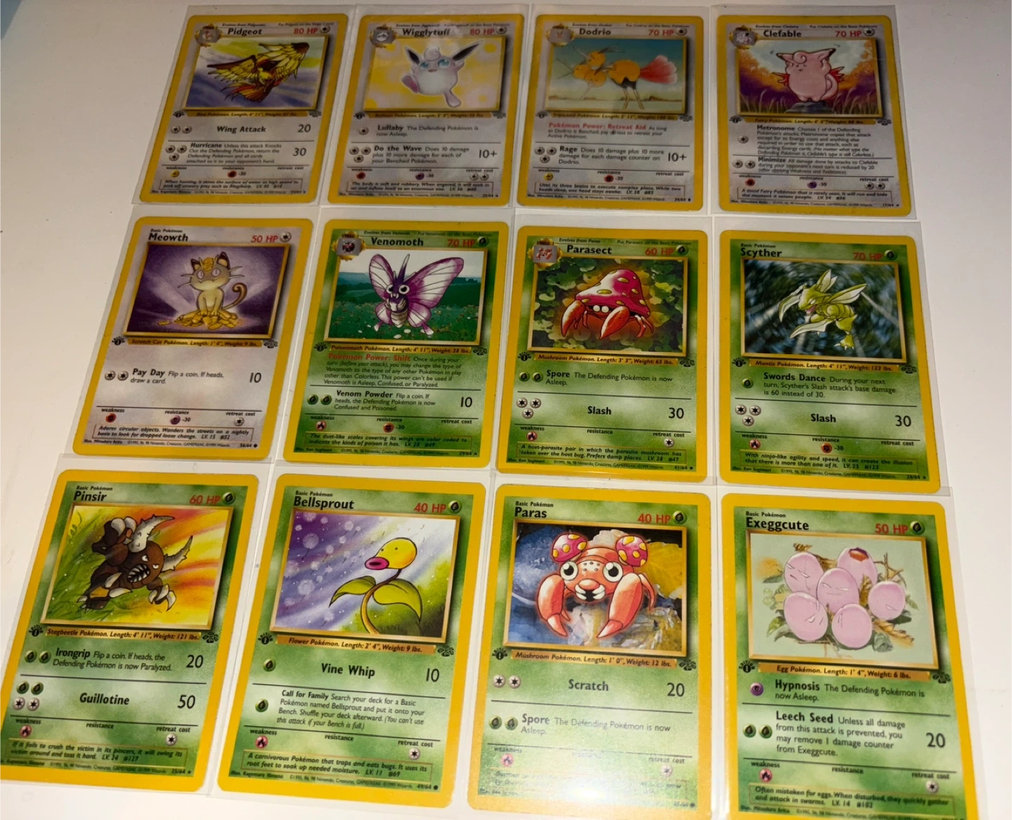 1st Edition Jungle Pokemon Cards 1999 WOTC Lot! Electrode (Holo Rare) - $80 *SOLD* Mr. Mime (Rare) - $50 Snorlax (Rare) - $60 Pidgeot (Rare) - $30 *SOLD* Wigglytuff (Rare) - $35 *SOLD* Clefable (Rare) - $25 *SOLD* Scyther (Rare) - $45 Venomoth (Rare) - $25 Pinsir (Rare) - $30 *SOLD* Dodrio - $15 *SOLD* Meowth - $15 Parasect - $15 Bellsprout - $10 *SOLD* Paras - $10 Exeggcute - $10