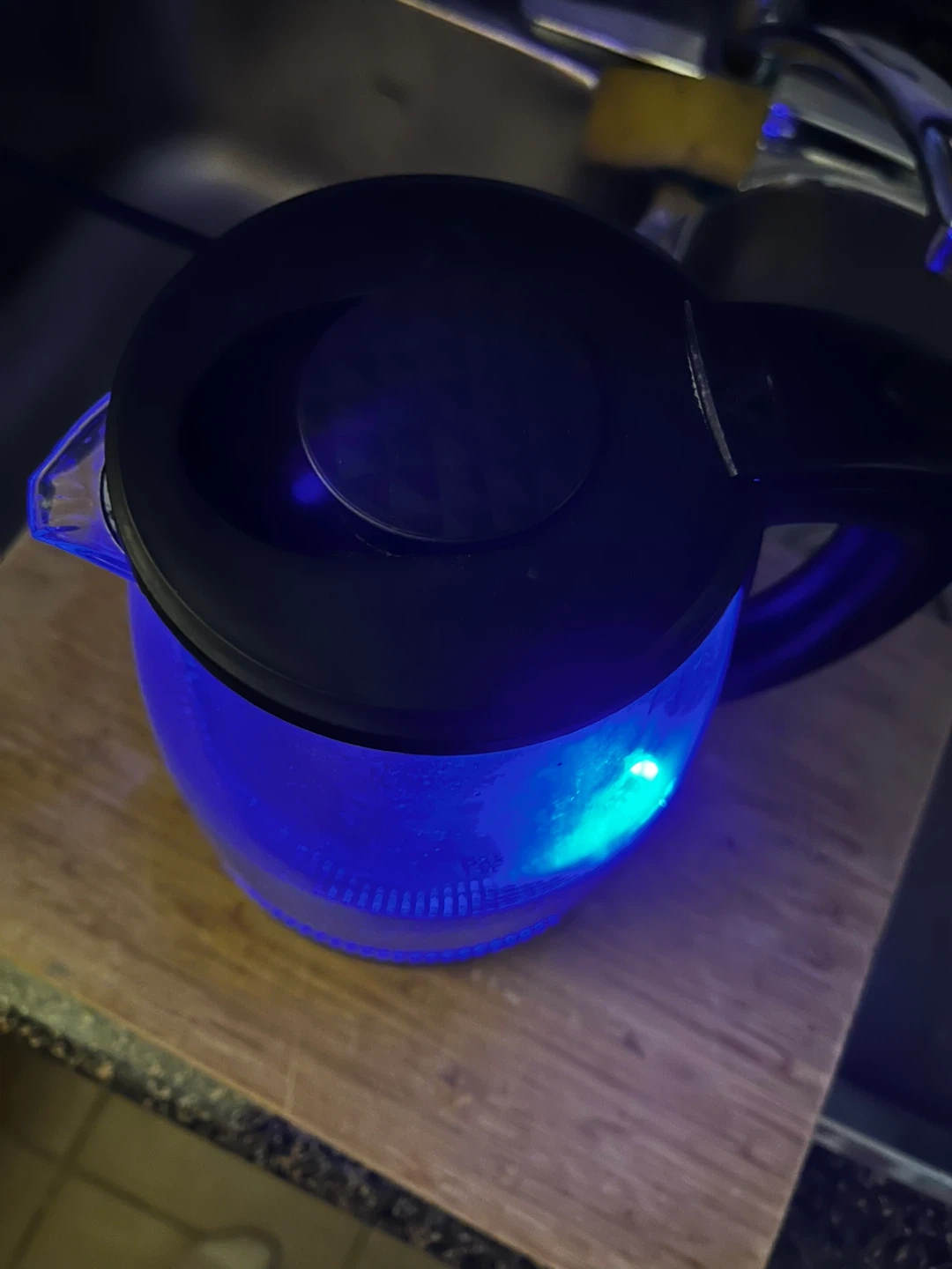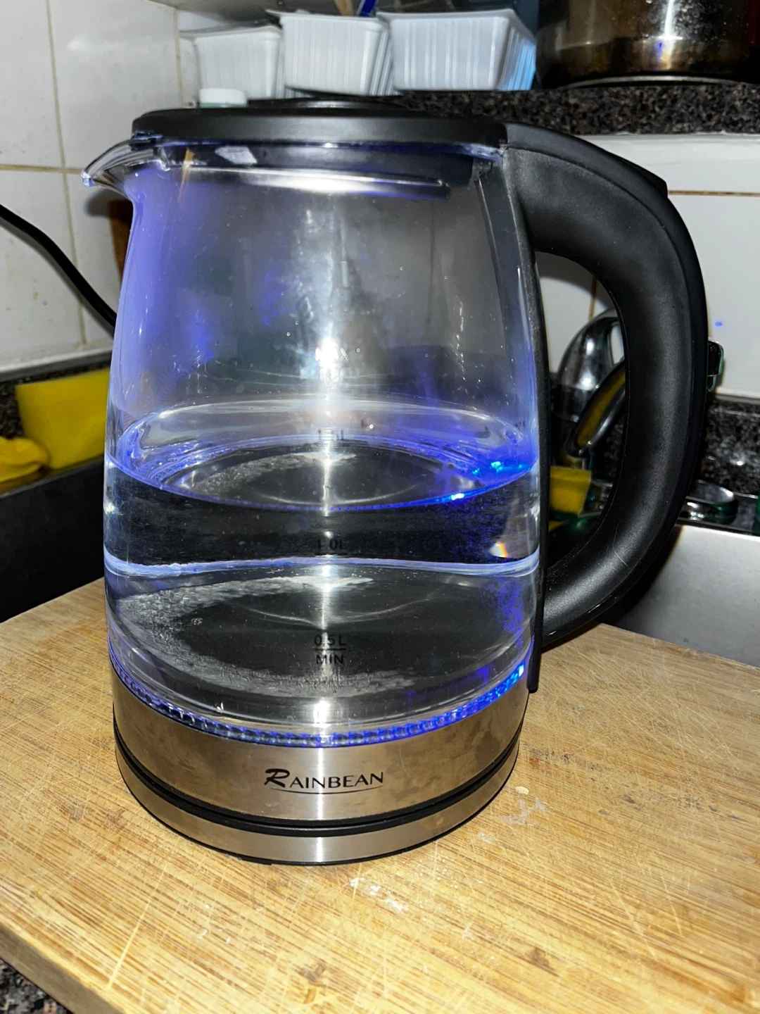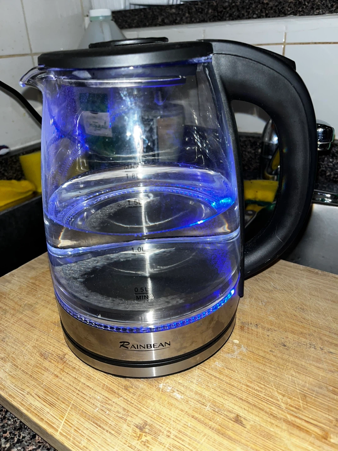 RAINBEAN glass electric kettle. It has a 1.7L capacity and lights up blue when in use.