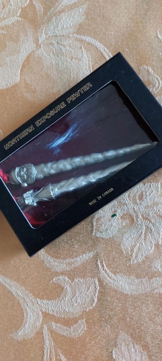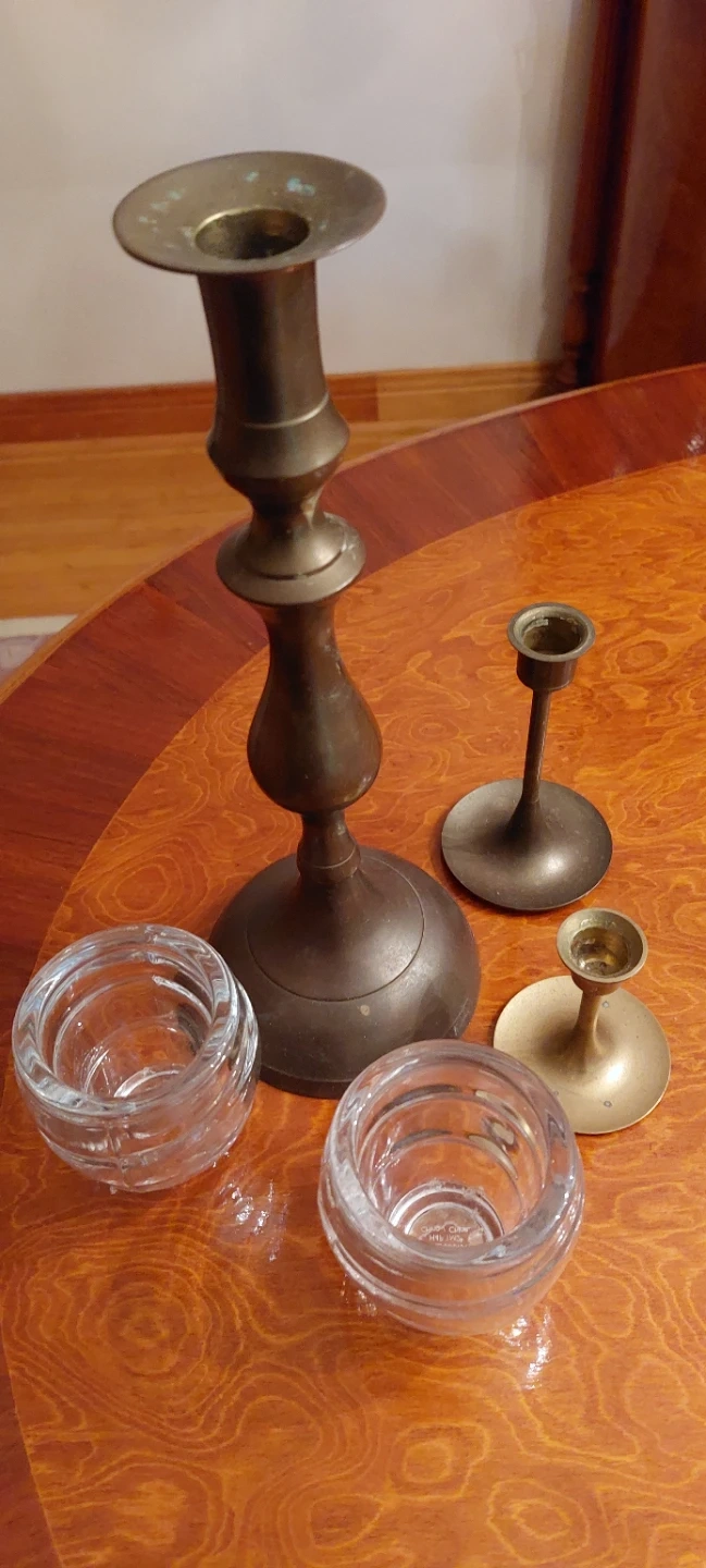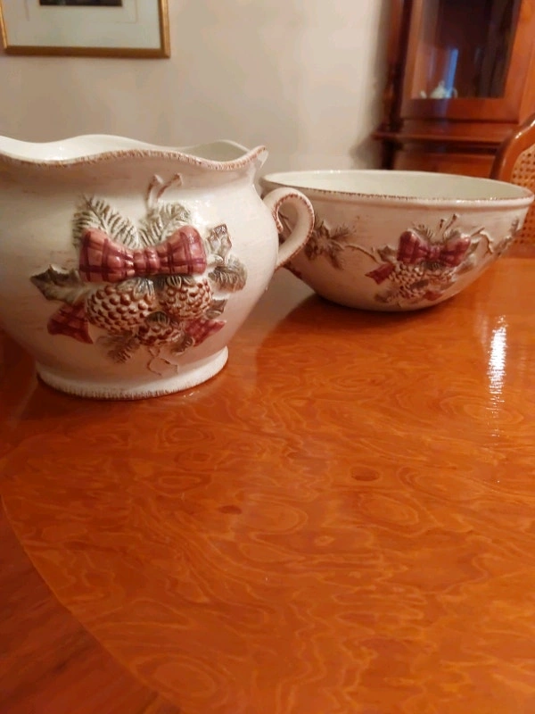 Two beautiful, big, matching bowls ...will look delightful and festive with pine branches, pomegranates, oranges, or whatever mood and atmosphere you desire or wish to create. Excellent condition Add-on ...Made in Canada "Northern Exposure Pewter" Two ornaments for your tree! PLUS three brass candlesticks and two glass candle holders. Great items- great deal!