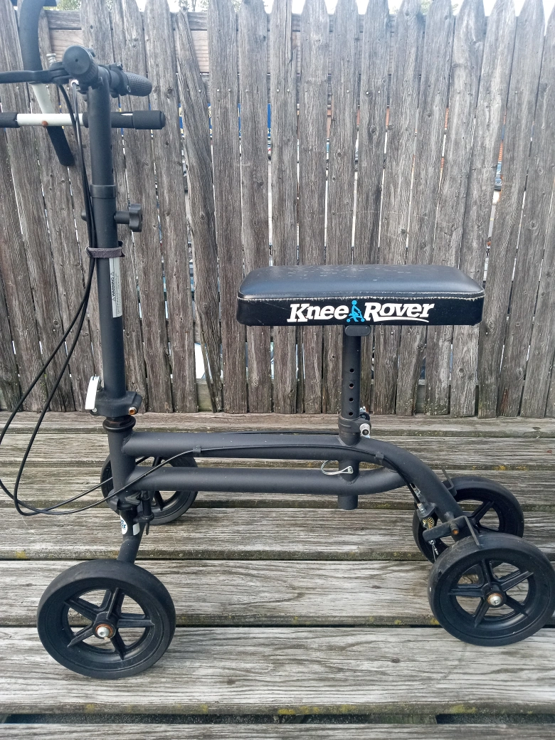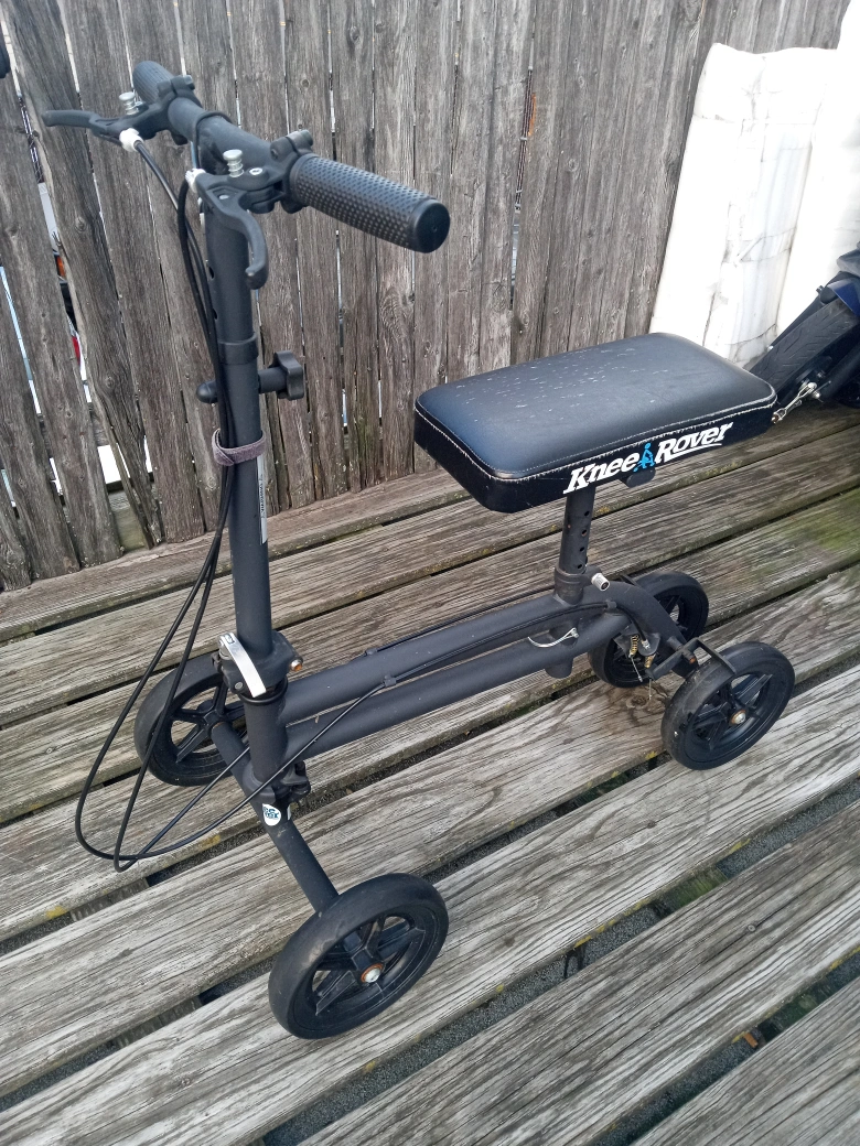 I'm selling a KneeRover knee walker. It's in good condition and ready to help you get around while recovering from a leg injury. It has a comfortable padded seat and smooth-rolling wheels.