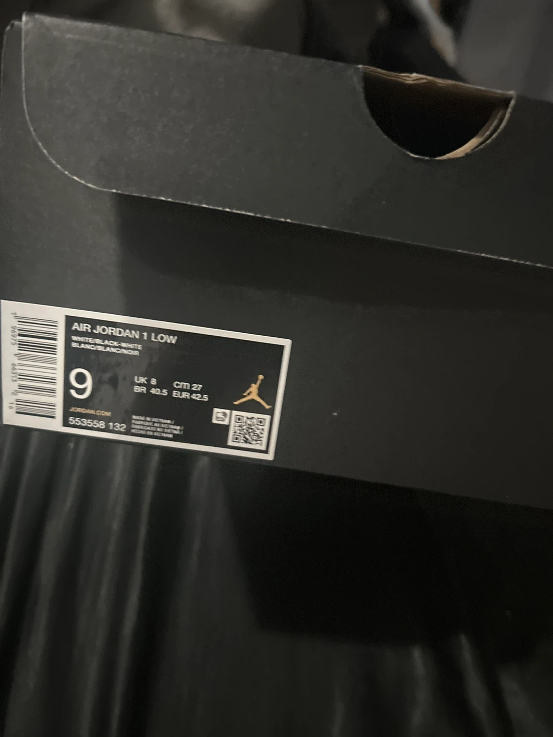 Selling a pair of Air Jordan 1 Low sneakers in white and black, size 9. They come with the original box