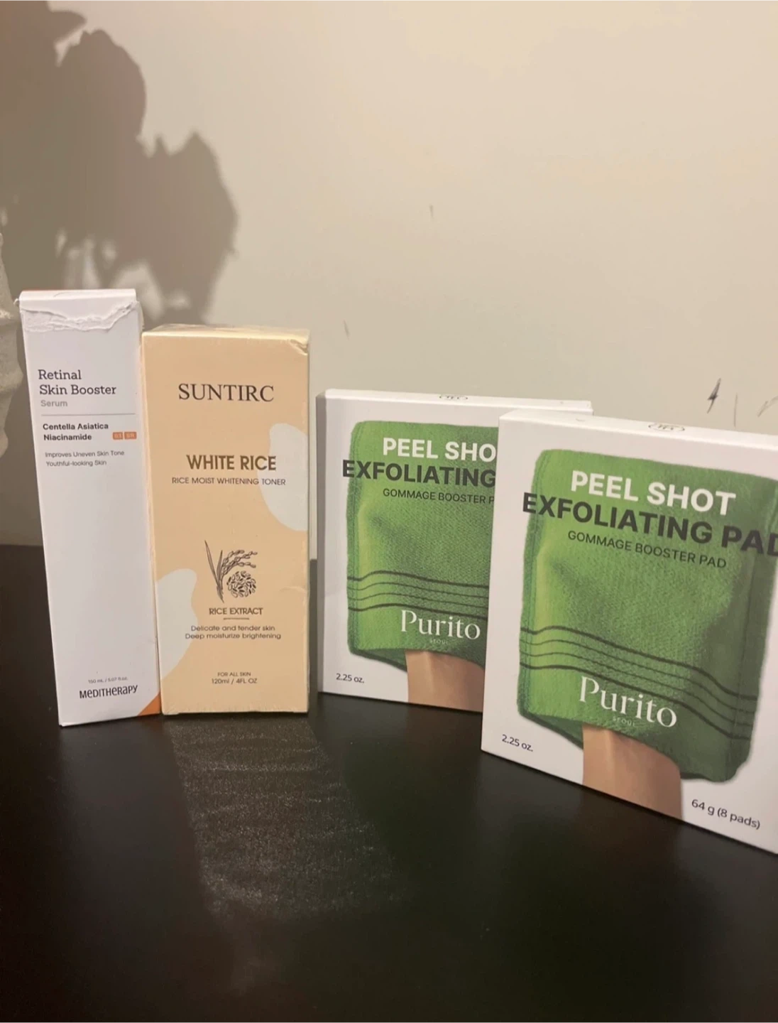 This set includes Medi-Therapy Retinal Skin Booster Serum and Suntirc White Rice Moist Whitening Toner. The serum aims to improve uneven skin tone for a youthful look. The toner is formulated with rice extract for deep moisturizing and brightening.