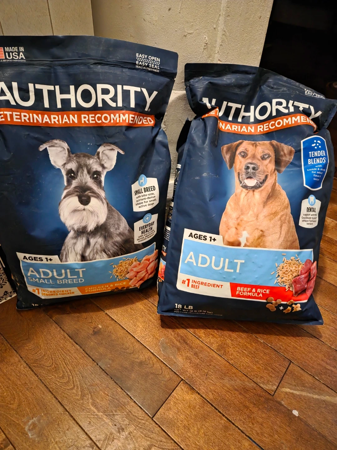 Two bags of Authority Veterinarian Recommended Adult Dog Food. One is a Small Breed Chicken & Rice formula, and the other is a Beef & Rice formula. Both are for ages 1+ and weigh 18 lbs each.