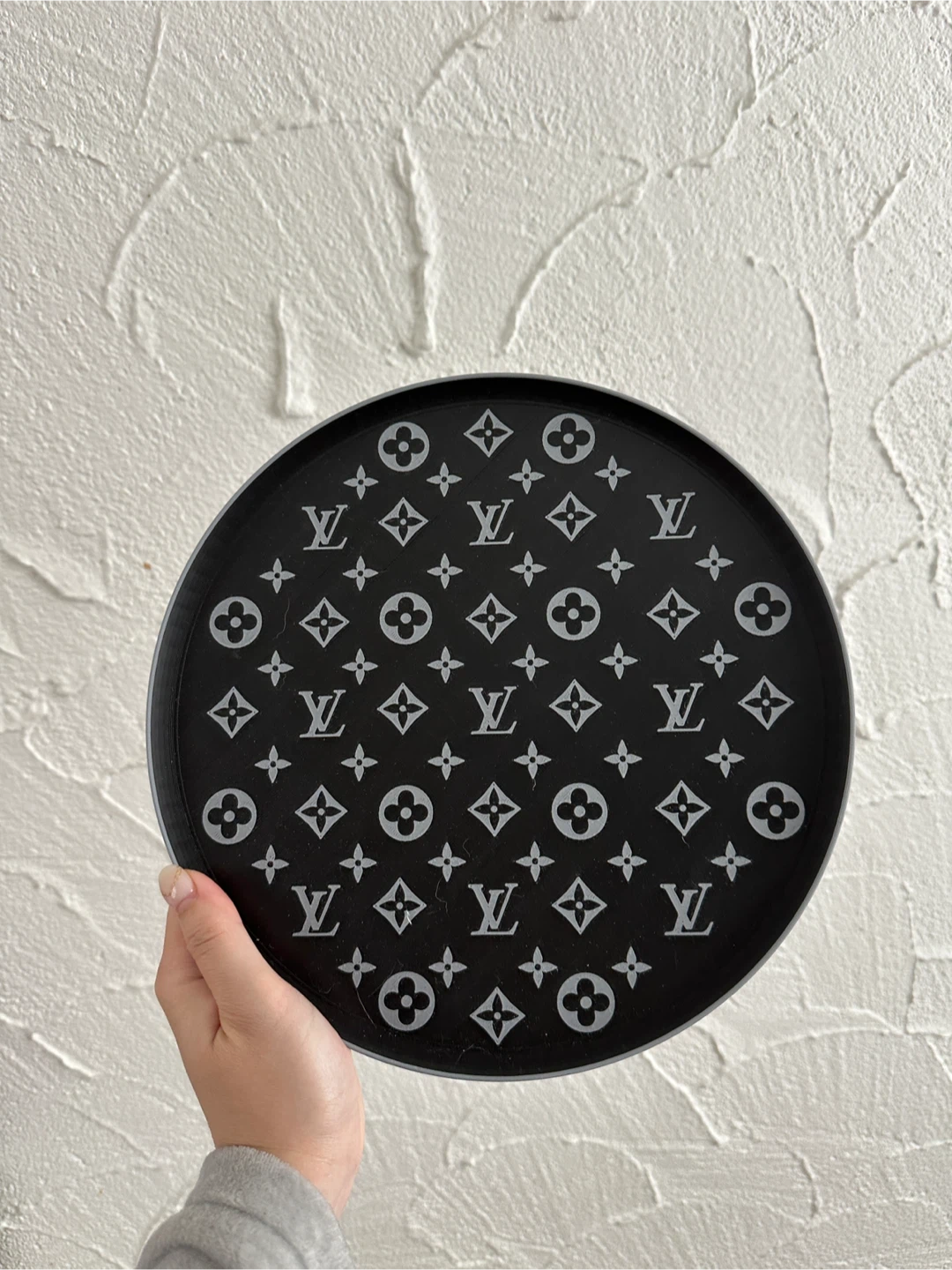 Black tray with the iconic monogram print. It's a stylish and versatile piece. This tray can be used for serving or as a decorative item.