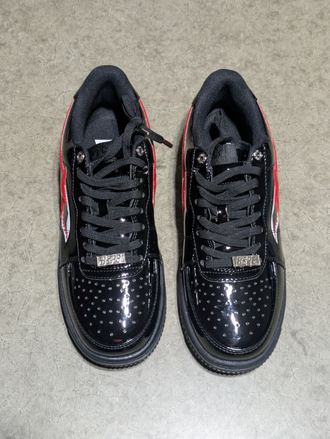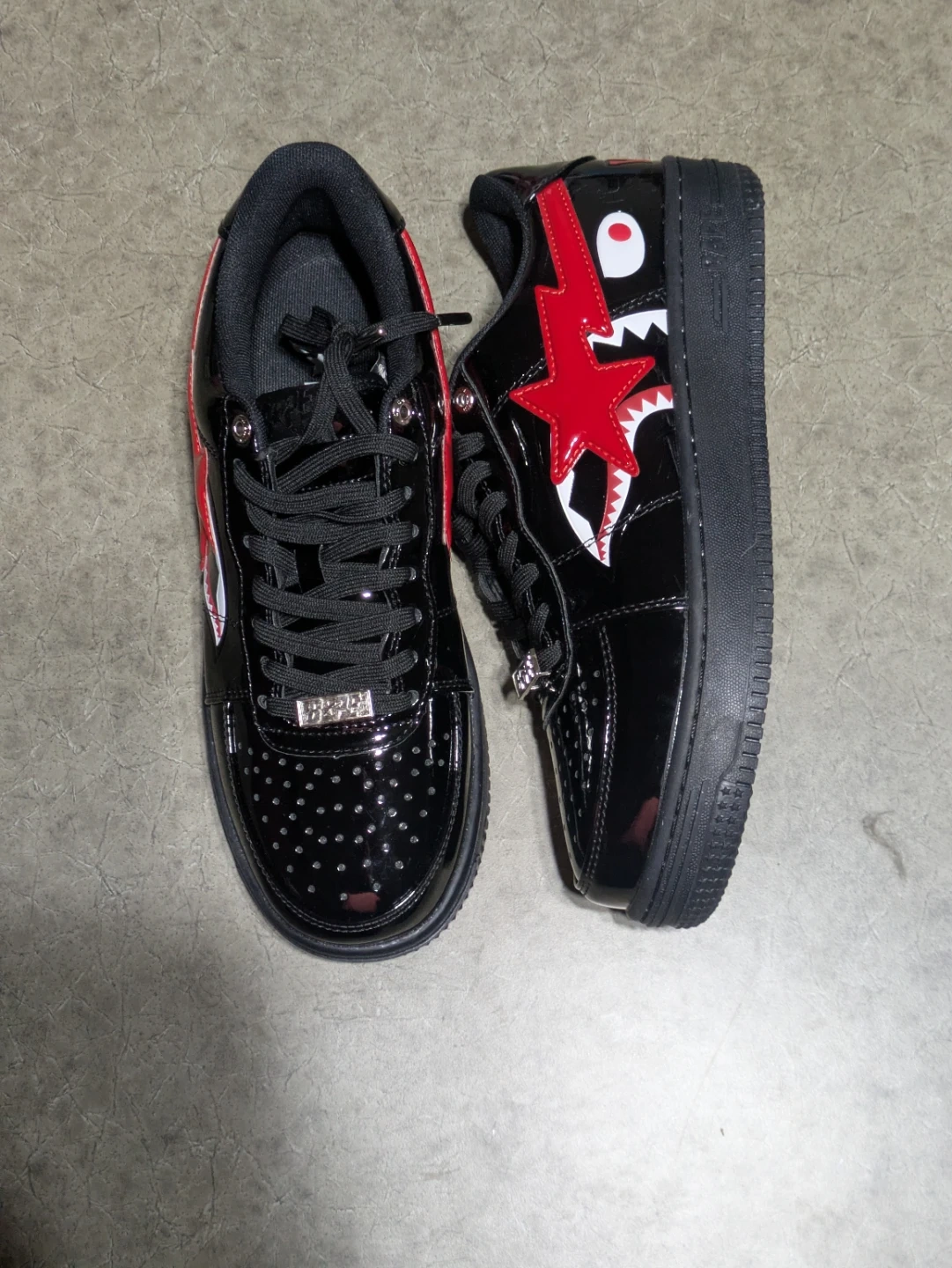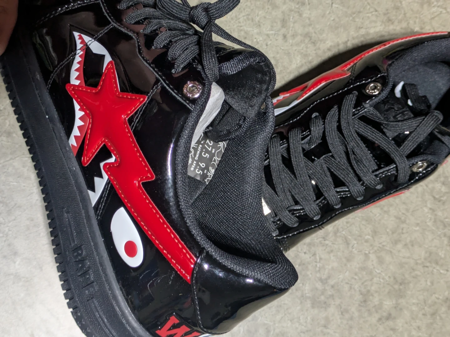 Black patent leather A Bathing Ape BAPE STA sneakers with red and white shark graphics. Men's US size 9.5, which is 27.5 cm.
