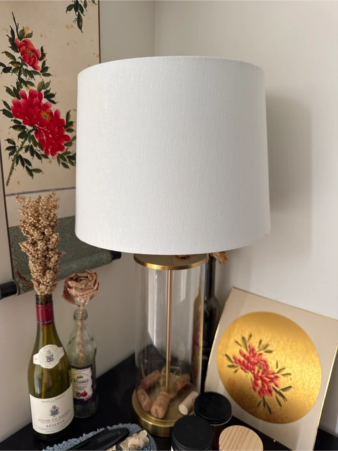 This table lamp features a clear glass cylinder base with a brass accent and a white fabric drum shade. It's perfect for adding ambient lighting to a living room or bedroom. The lamp has a metallic interior rod and comes with corks displayed inside the base.