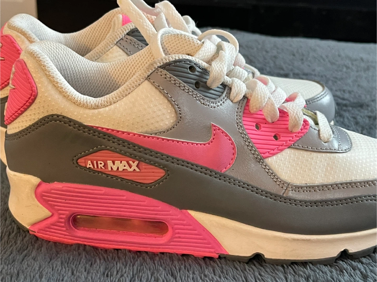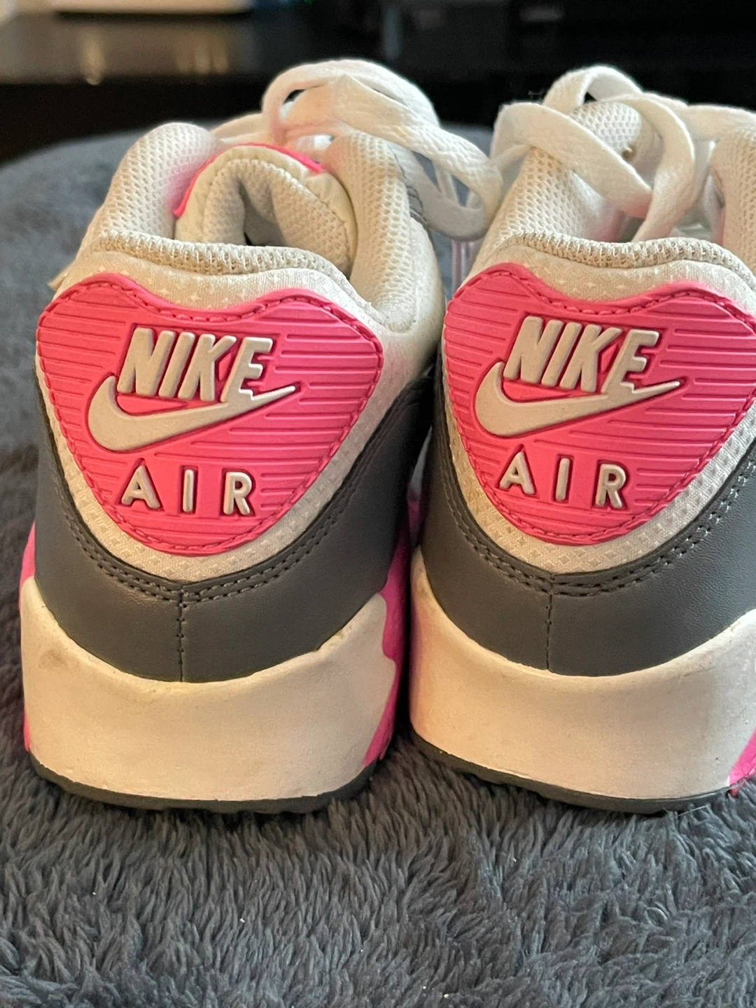 Only pick up at 806 kennedy road and cash only please! These Nike Air Max 90s are a women's size 7. They feature a white, pink, and grey colourway. The shoes have the classic Air Max cushioning visible in the sole. These are great for everyday wear!