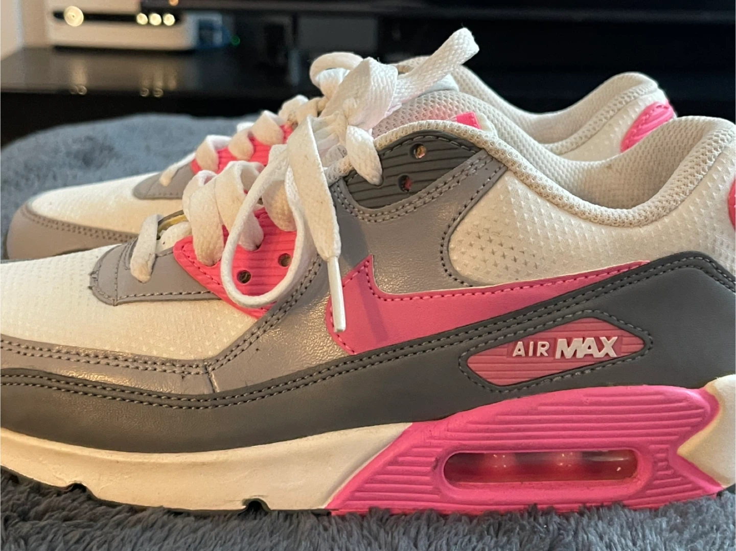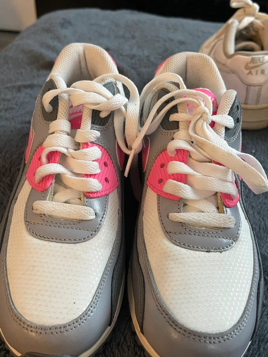 Only pick up at 806 kennedy road and cash only please! These Nike Air Max 90s are a women's size 7. They feature a white, pink, and grey colourway. The shoes have the classic Air Max cushioning visible in the sole. These are great for everyday wear!