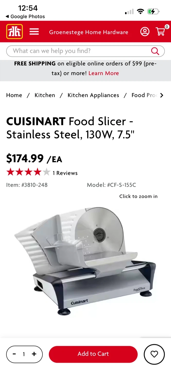 This Cuisinart food slicer is made of stainless steel. It's 130W and has a 7.5" blade. It's great for slicing meats and cheeses at home!