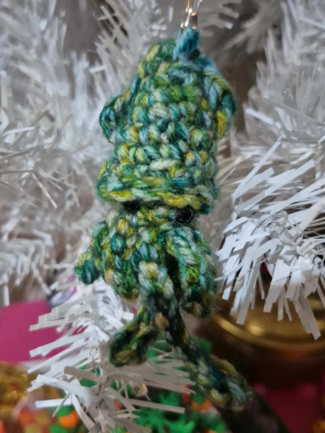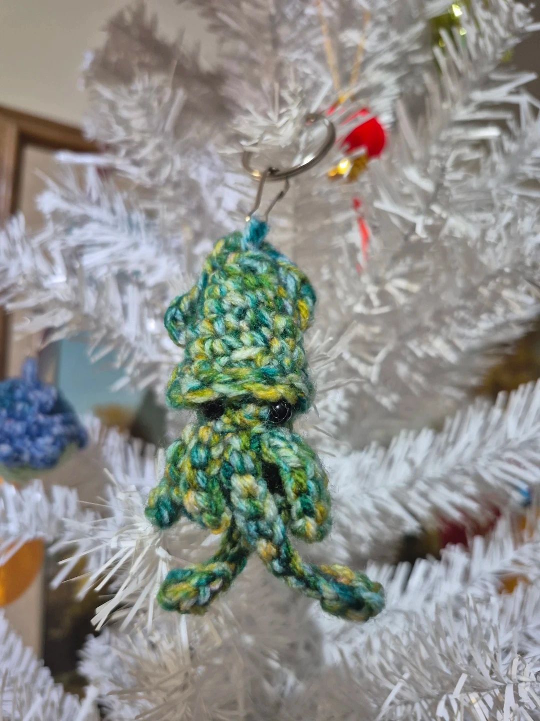 This is a cute, handmade crochet squid. It's green and yellow with black button eyes. It comes with a keyring, so it can be used as an ornament or a keychain. Perfect for adding a quirky touch to your tree or bag!