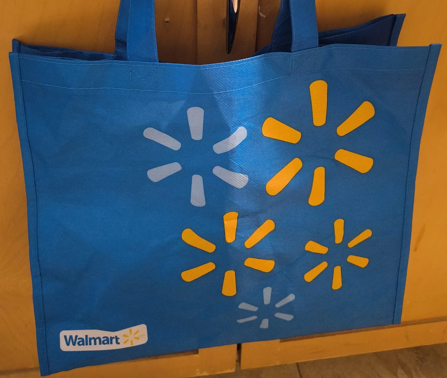 Blue reusable shopping bag from Walmart. It's made of durable non-woven material and features the Walmart logo. Great for groceries or everyday errands!