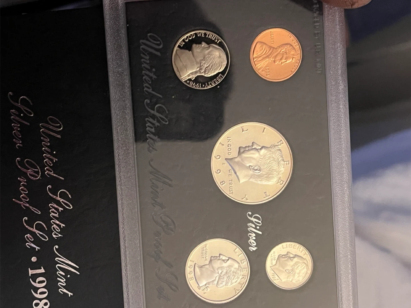 Includes coins from the 1998 United States Mint Silver Proof Set. Features the Kennedy half dollar, dime, nickel, and cent. This is a collectible set from the mint.