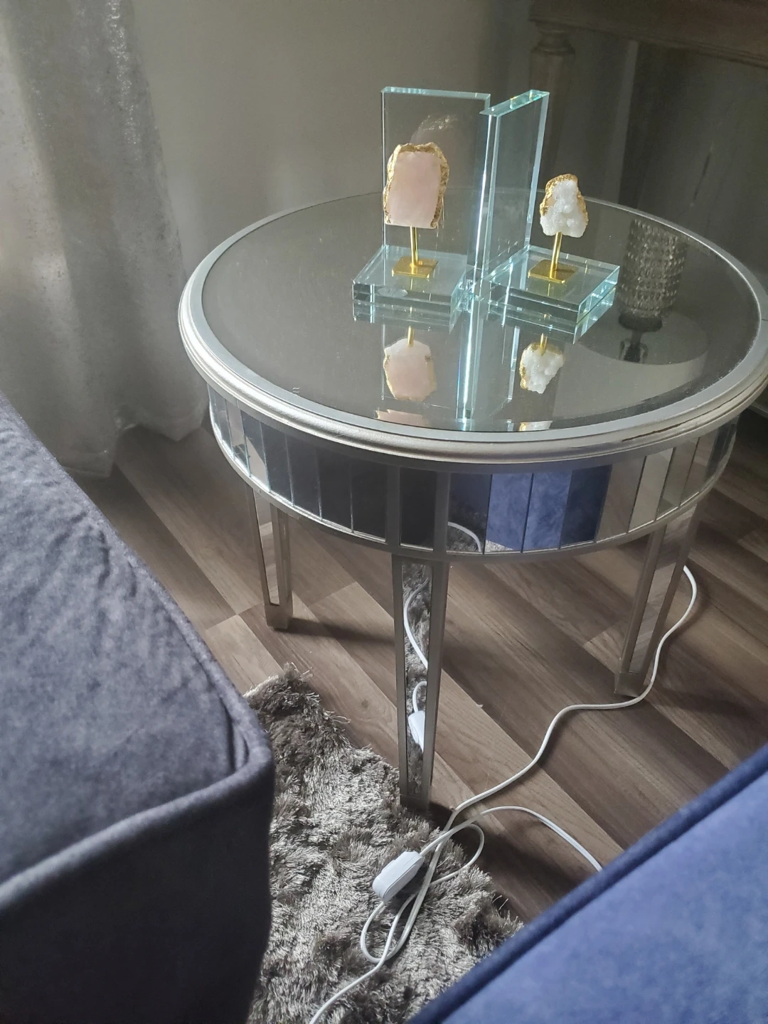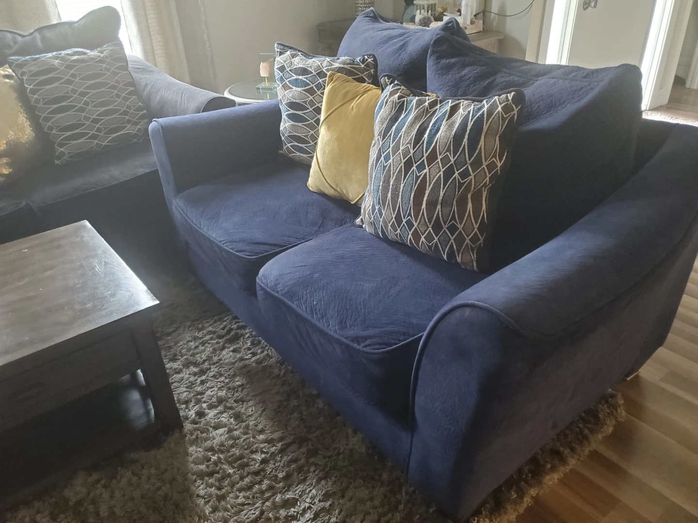 Comfortable navy blue/ black velvet sofa and matching loveseat. Plush cushions provide ample seating. Includes decorative throw pillows. Great for a living room setup! The coffee table and the nightstand not included, but we can negotiate the price if interested. No pets.