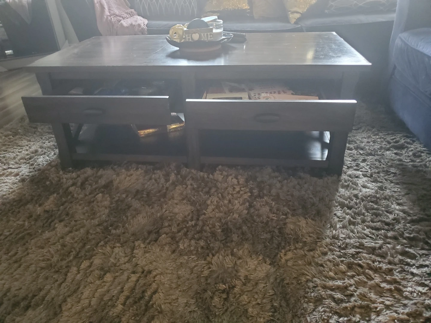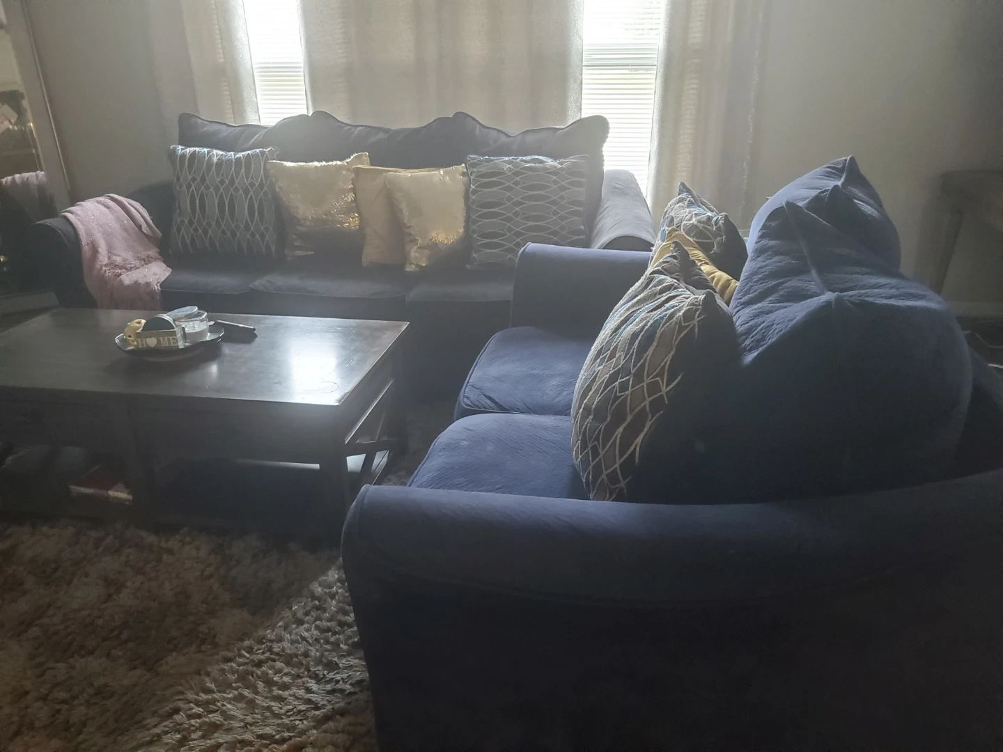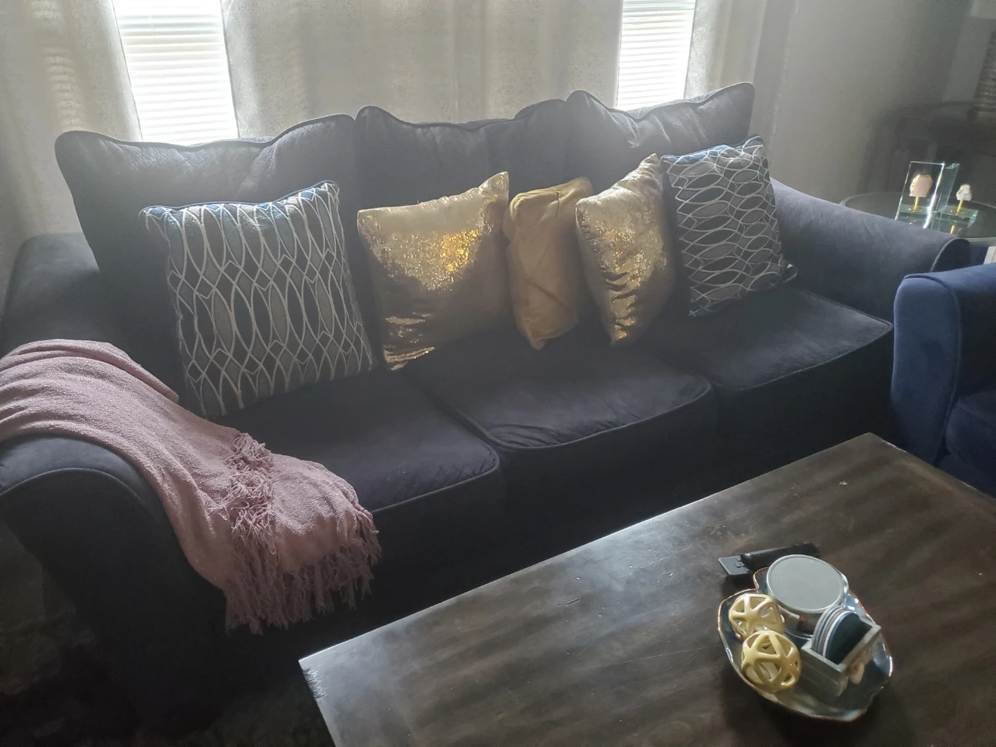 Comfortable navy blue/ black velvet sofa and matching loveseat. Plush cushions provide ample seating. Includes decorative throw pillows. Great for a living room setup! The coffee table and the nightstand not included, but we can negotiate the price if interested. No pets.