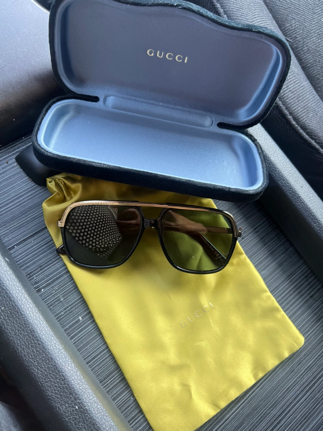 Men’s Stylish Gucci sunglasses, model GG0202S 001. These sunglasses come with their original case and a Gucci dust bag. Retails 450.00 - slightly used.
