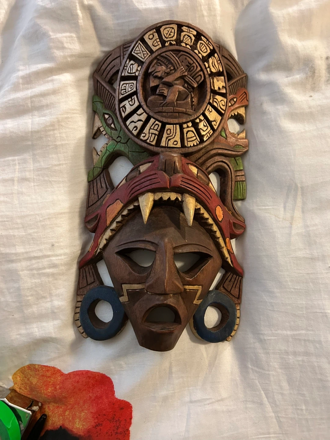 Beautifully carved wooden Mayan mask. This unique piece features intricate details and vibrant colours. Perfect for adding a touch of cultural artistry to your home decor