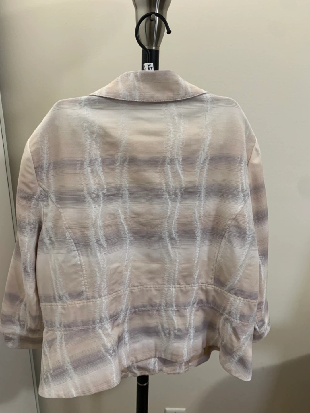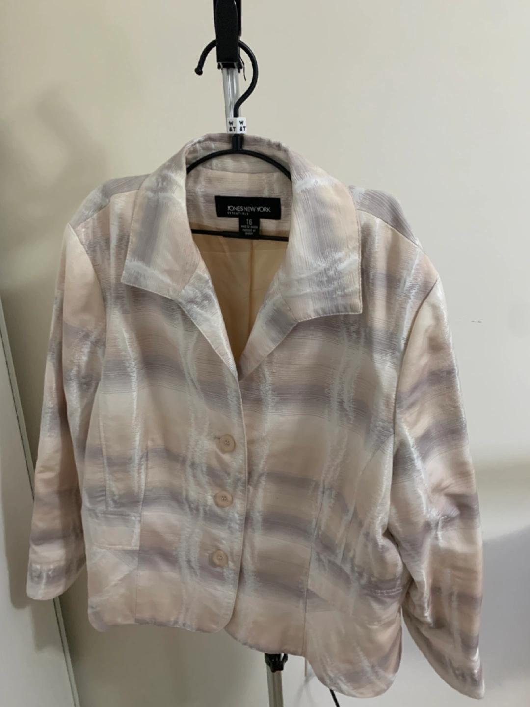 Women's blazer, size 16. Beige and grey pattern. Three button closure. Long sleeves. Excellent for work or special occasions.