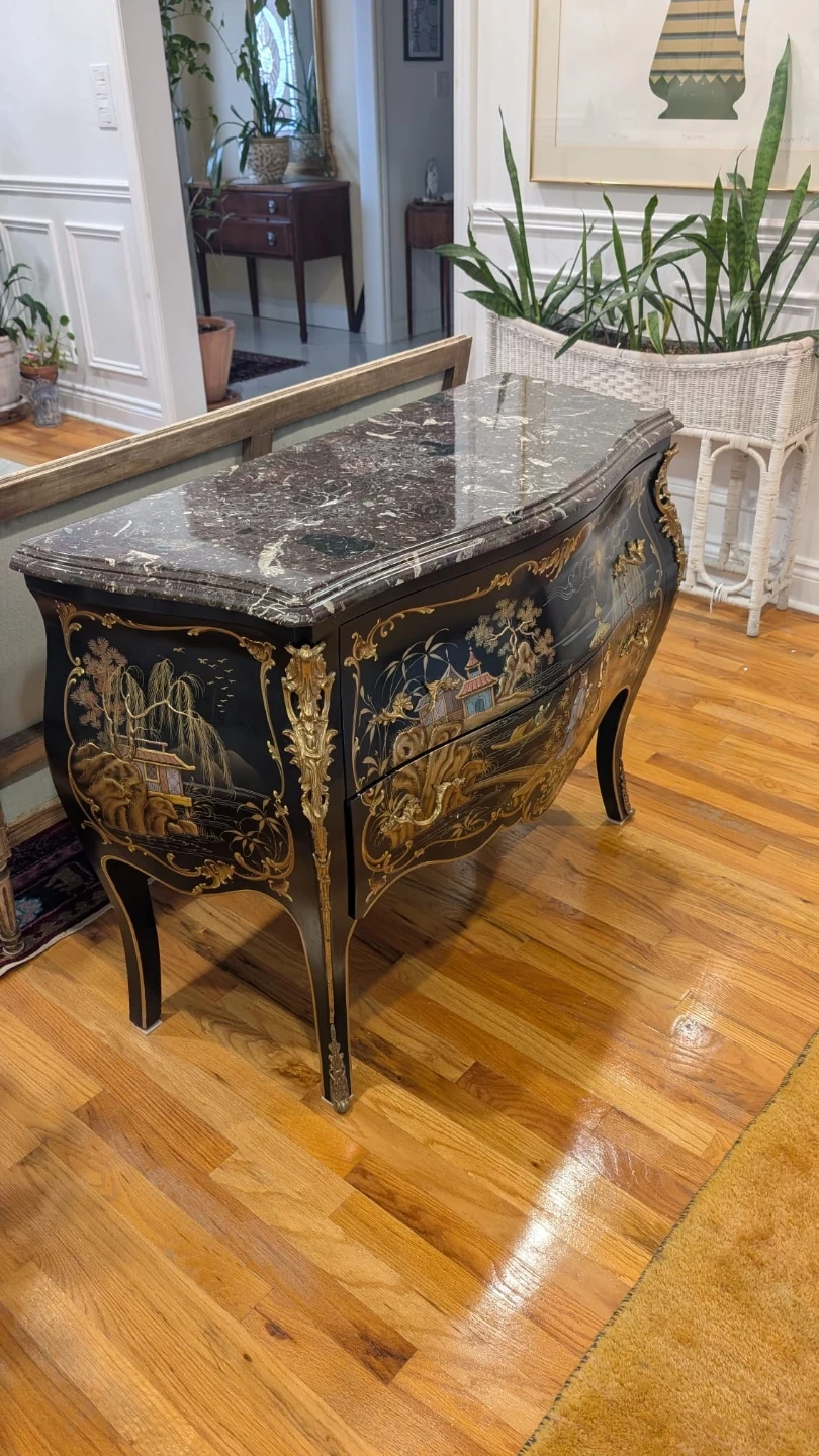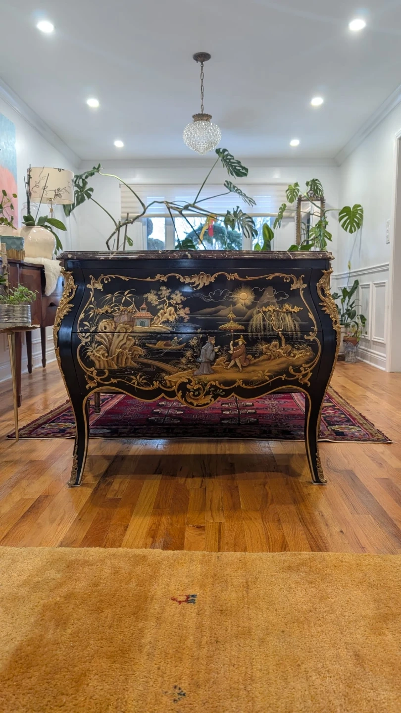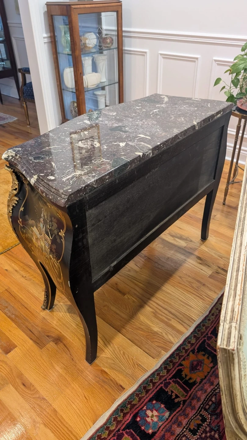 Vintage French Chinoiserie Black Lacquer Bombe Commode