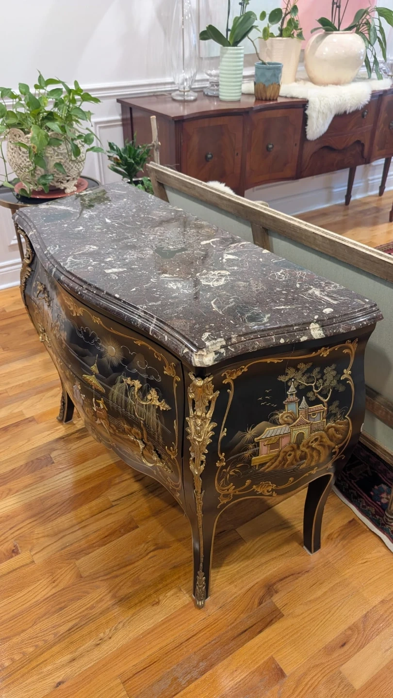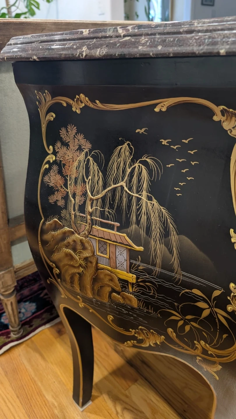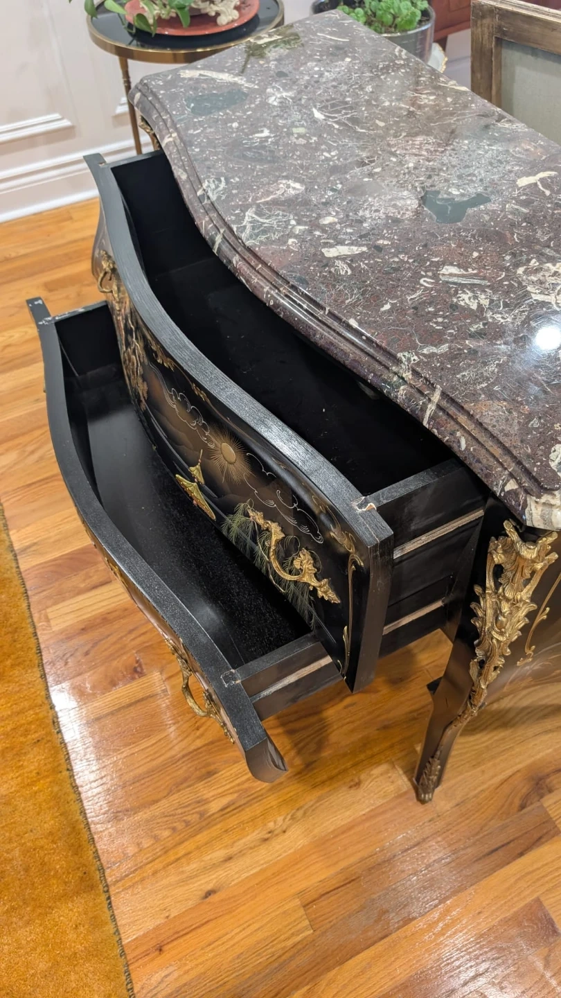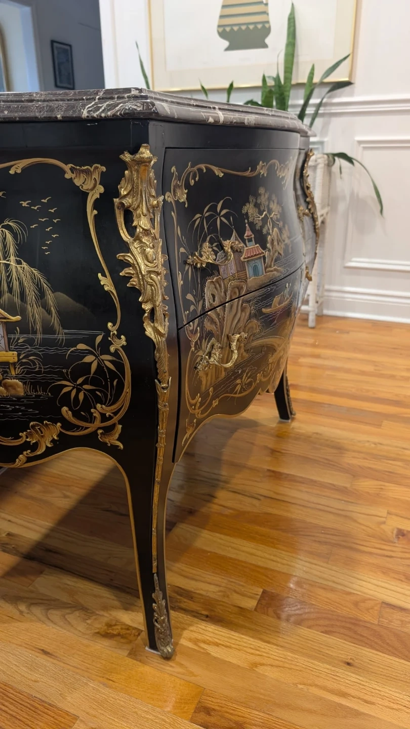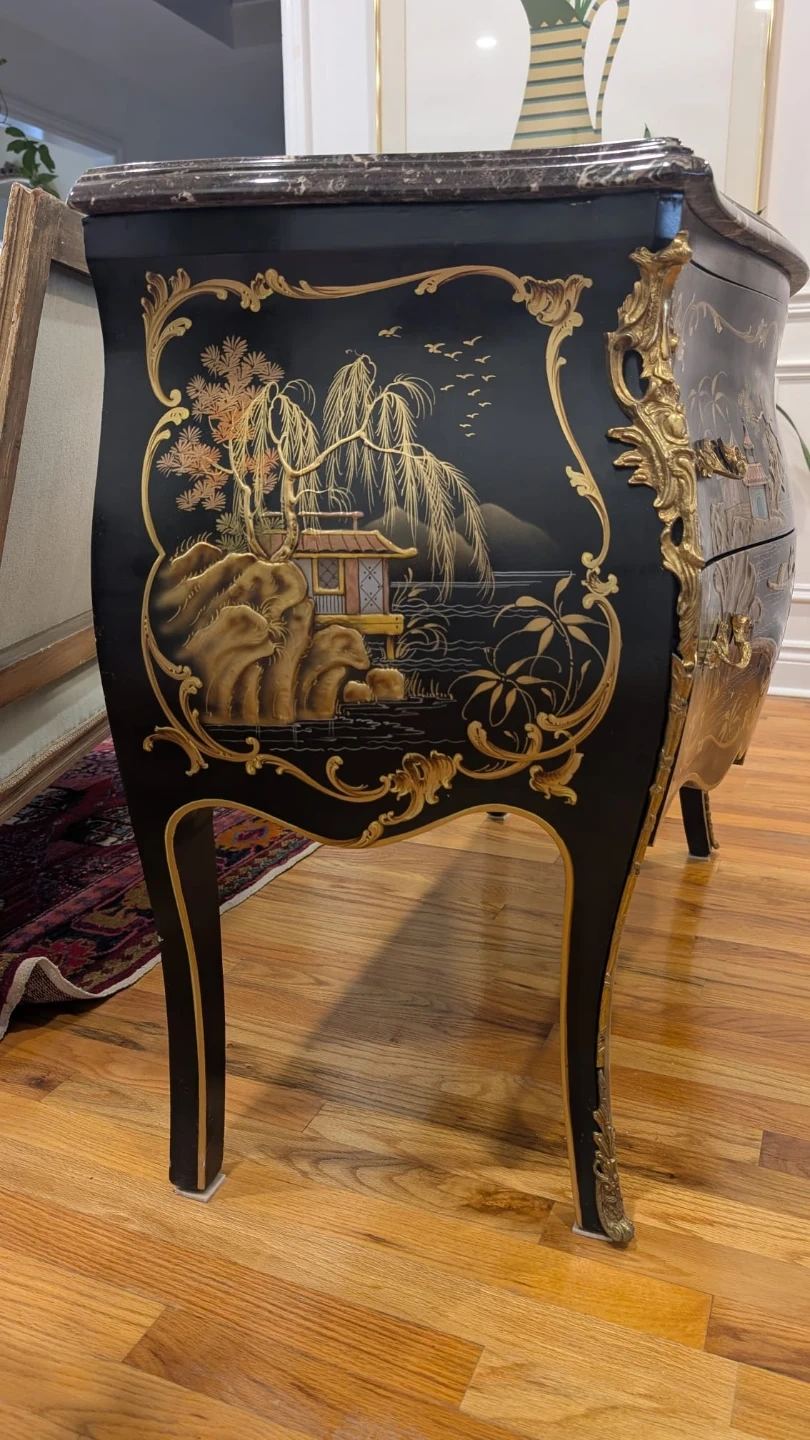 Vintage French Chinoiserie Black Lacquer Bombe Commode