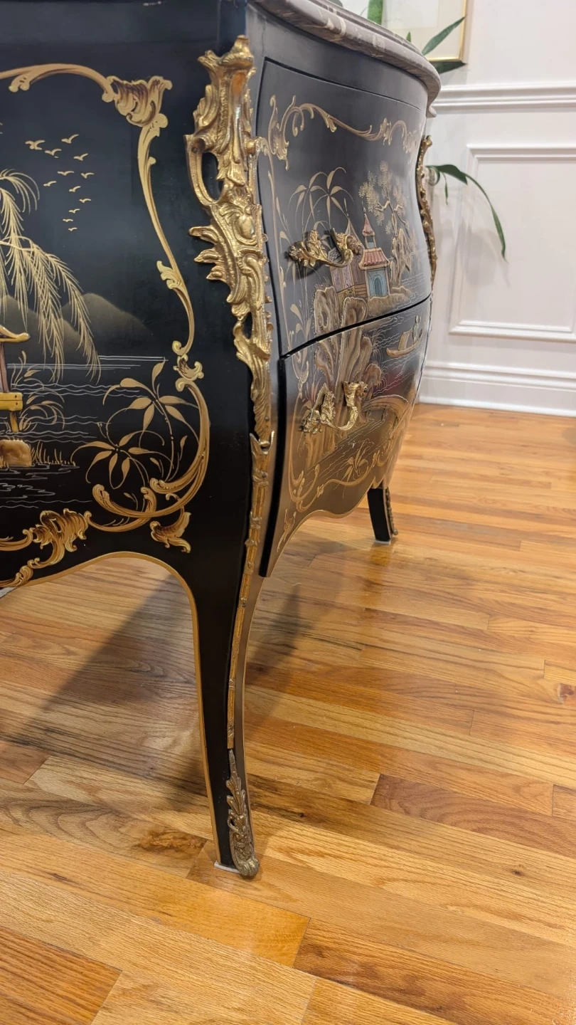 French Chinoiserie Black Lacquer Bombe Commode showcases the French adaptation of what was then termed the Style Oriental in a brilliant effort to duplicate the majesty of the exotic Far East which was the rage. The hand-painted scenery on the black lacquer backdrop is a panoramic view of an opulent moonlit landscape, with continuations on each side totaling three original artworks. The bombe form creates a curved surface that is visually appealing, protected in the front by cast brass trim that extends from the marble to the floor. Cast brass drawer pulls add a nice touch, as does the luxuriously veined marble top that is beveled and contoured to follow the casework form below.