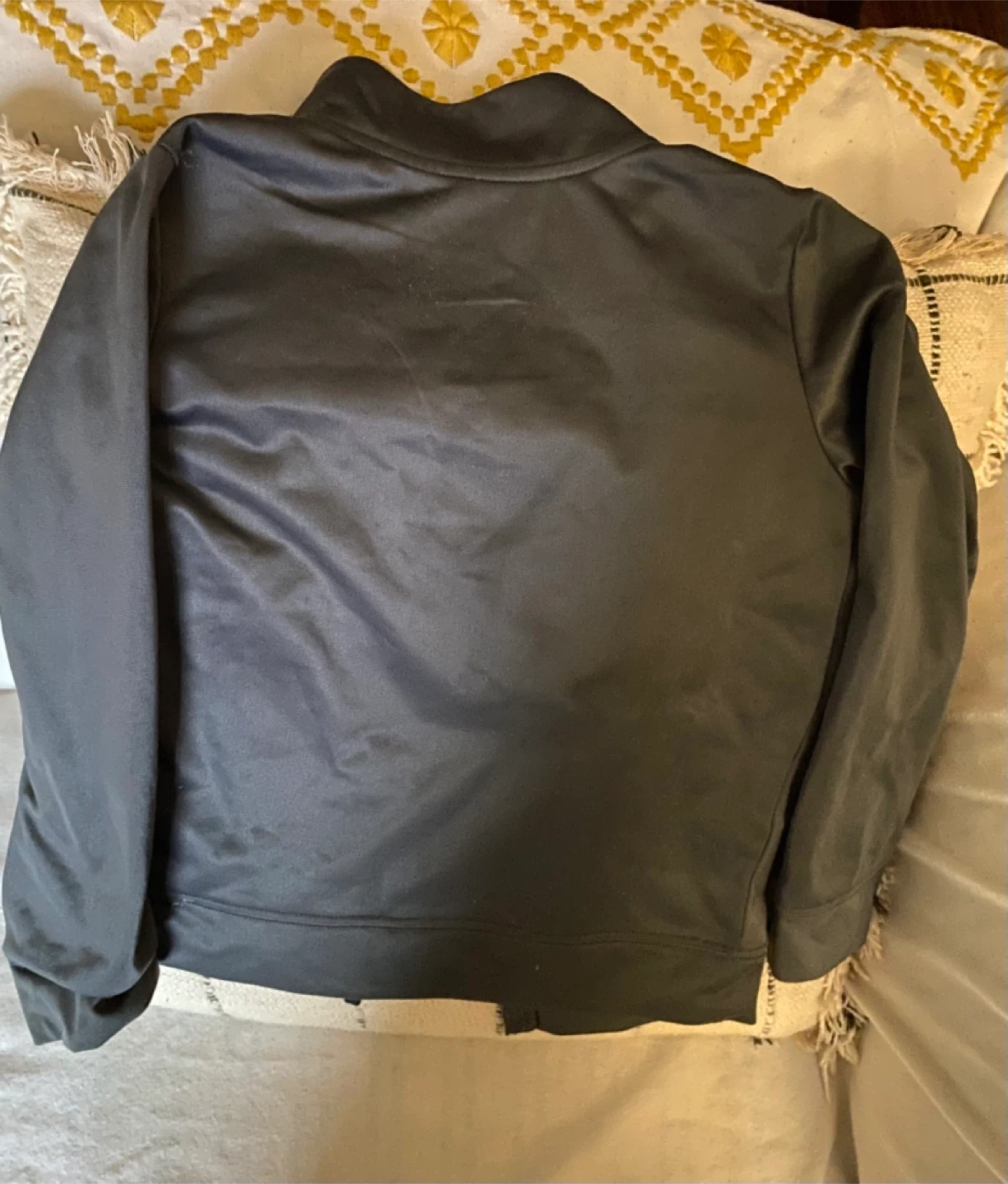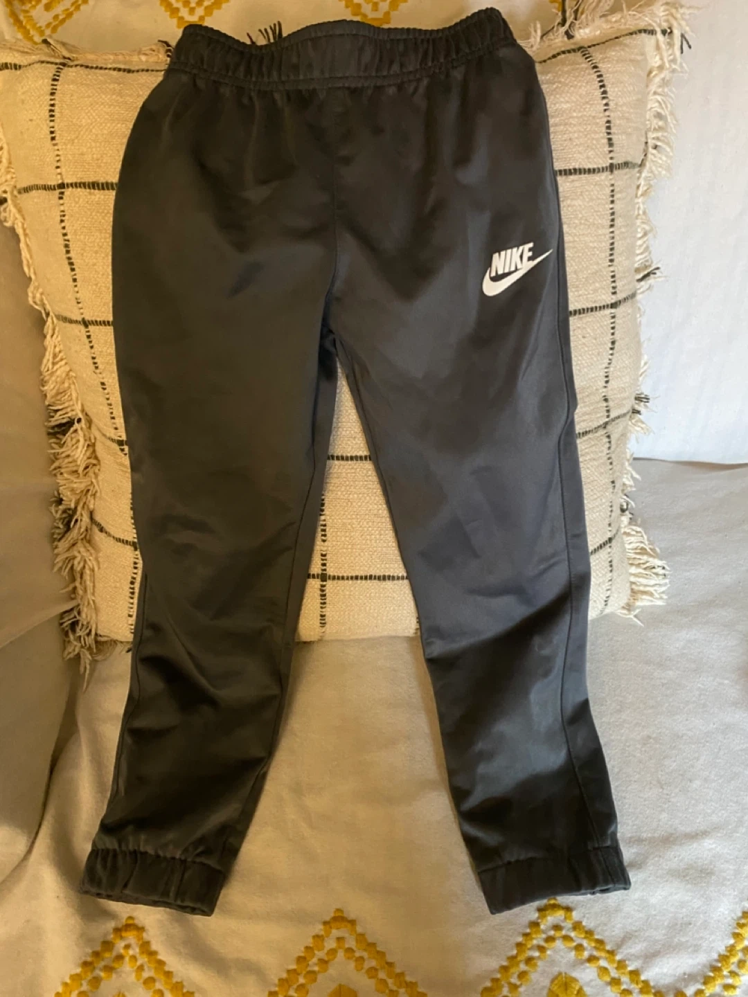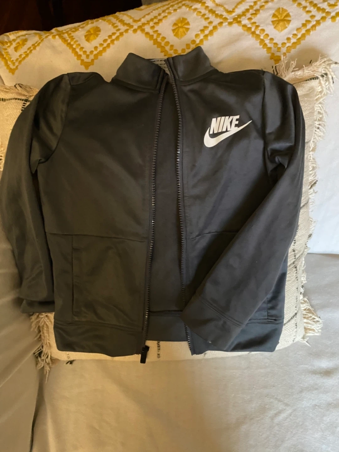 This is a kids' Nike tracksuit set in dark grey. It includes a zip-up jacket and matching pants. Both pieces are made from 100% polyester. The jacket has pockets and the pants have an elastic waistband. Perfect for active kids!