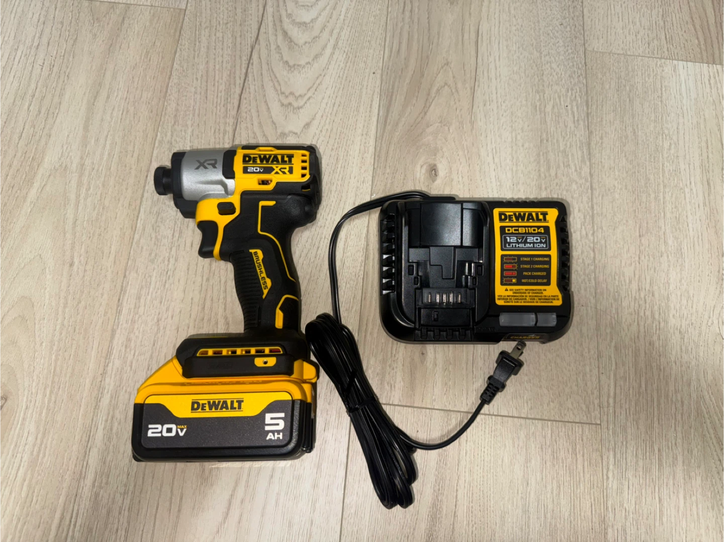 Includes a DEWALT 20V MAX XR impact driver, 20v a 5Ah battery, and a DCB104 charger. The charger is compatible with 12V and 20V Lithium Ion batteries. Get your projects done with this reliable power tool set! brand new just has no box,got it from work as a present just don’t need it