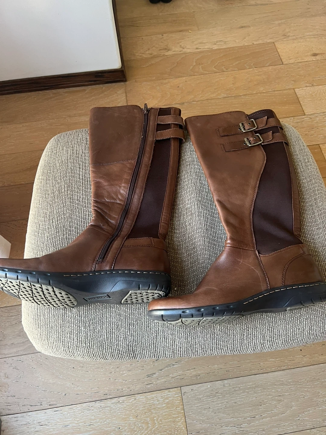 These are stylish brown tall boots. They feature side zippers for easy on and off, and buckle details on the side. The soles are durable and offer good traction.size 8M