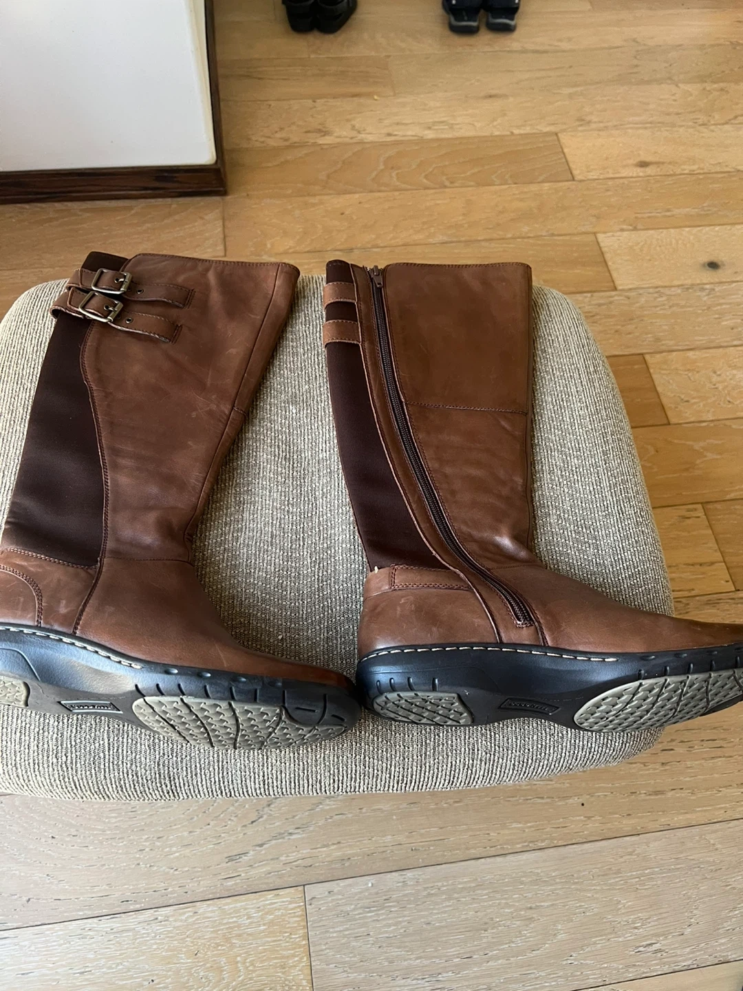 These are stylish brown tall boots. They feature side zippers for easy on and off, and buckle details on the side. The soles are durable and offer good traction.size 8M